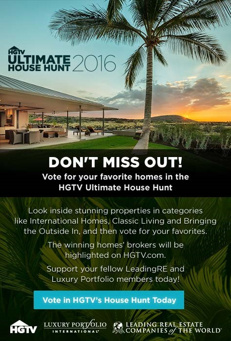 HGTV的最後議院狩獵進行中,以從世界®和豪華股份單國際性組織成員的主要房地產公司的難以置信的目錄為特色!參觀www.hgtv.com/househunt觀看八個扣人心弦的類別的所有決賽選手。比賽跑直到7月7日,因此是肯定傳播詞和表決您的喜愛的。