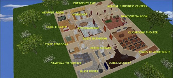 Не похож на другие укрытия выживания этот комплекс заполнен с богатыми приятностями которые делают его чувствовать больше как роскошные свойство, гостиница или круиз. Уровень одно отличает общими площадями включая большой домашний кинотеатр с посадочными местами для 15, польностью оборудованной медицинской комнатой, кухней товарного сорта и больше. Взбираясь более дальнейший спуск в характеристики уровня 2 объекта 4 квартиры, каждых 600 квадратных ног с 2 полными спальнями, кухня и столовая, большая ванная комната и живущая комната с ТВ и интернетом.