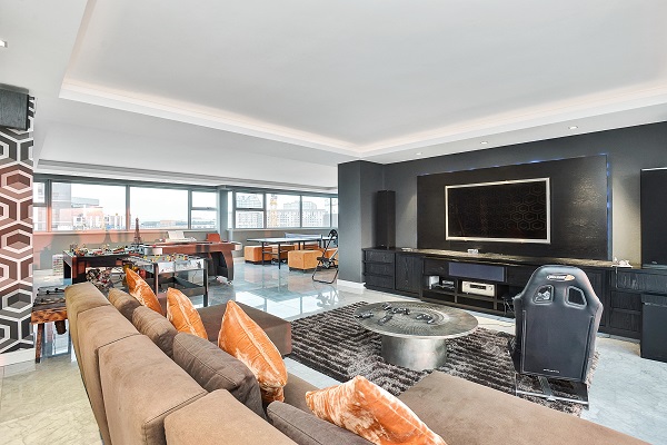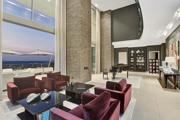 - 在Sandton,南非,約翰內斯堡的一個富有郊區,顏色的一種更加微妙的應用被運用重讀在這個當代頂樓房屋中的更加無言的口氣。而紫色、桔子和褐紫紅色小心地被安置的接觸保持環境歡樂,灰色樹蔭提供別致,設計師感受。在特別是這間屋子裡,在長沙發的橙色在球台附近的羽絨枕頭和hassocks抵消了主要用途對黑和灰色。另外,牆壁的紋理和地毯促進創造性的設計提供是與奧妙感覺的樂趣的屋子。