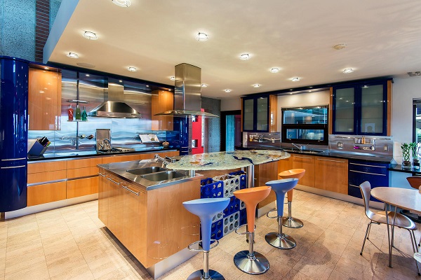 - 廚房是刺激創造性的另一個巨大地方通過顏色,并且這裡諾,內華達,住所做那與一個視覺上觸擊的組合的藍色和橙色。藍色可能有時遇到作為寒冷,但是用於細木家具和裝置的這片深樹蔭提出補全桃子被定調子的barstools的一種鎮定的感覺。整體作用有鼓勵與一種安慰性的接觸的烹飪創新高能空間的印象。