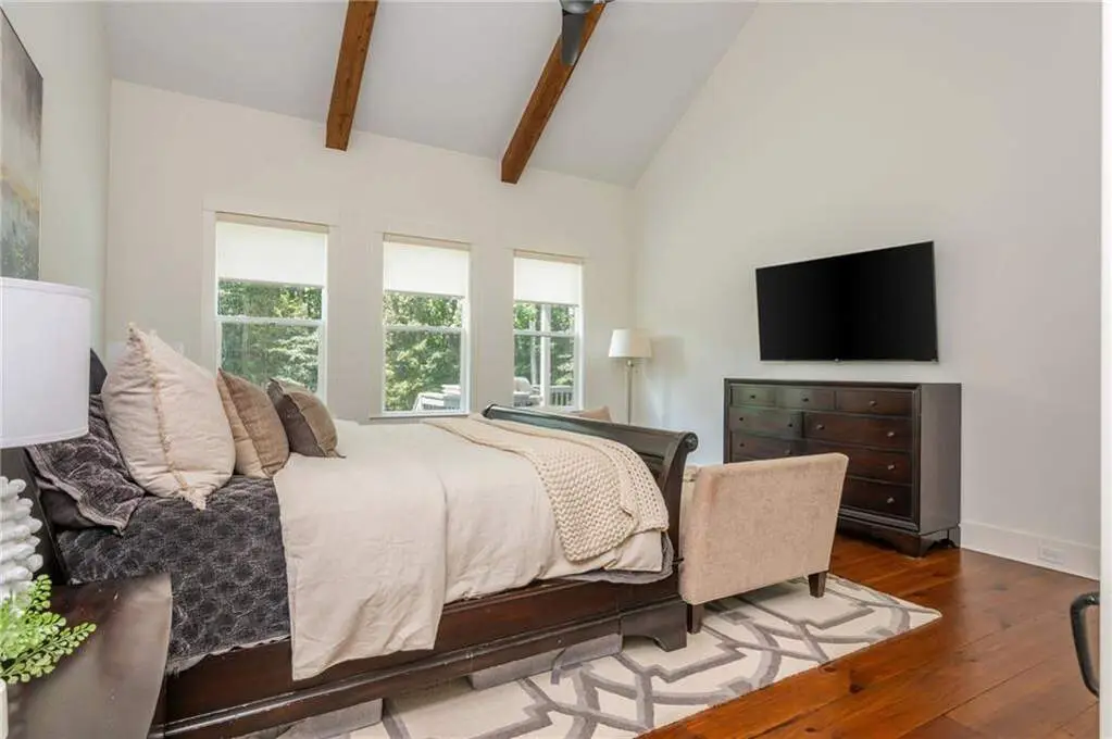 Vaulted, beamed ceilings in primary suite