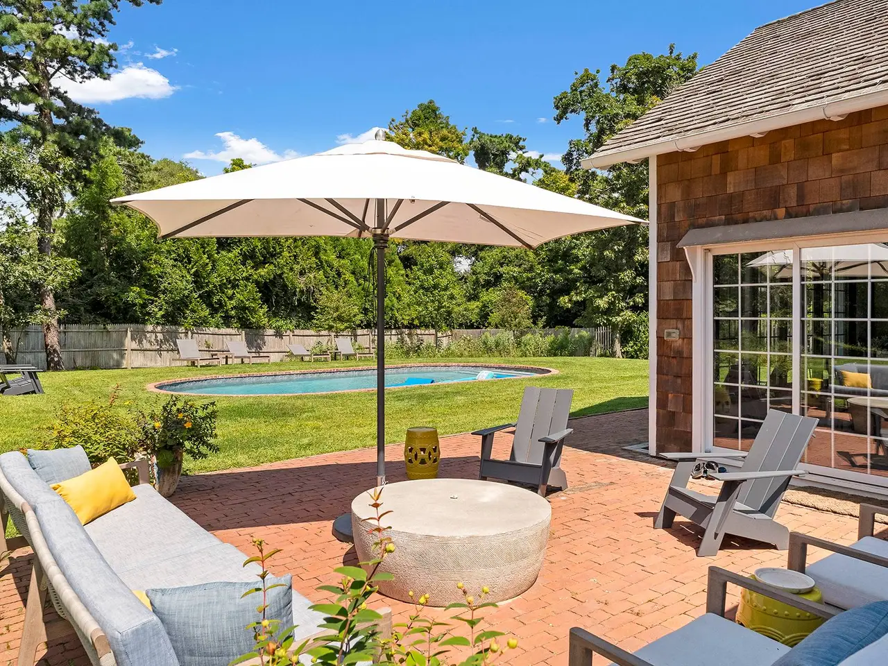 Rental Registry #23-1242 Located in Beach Hampton, Amagansett Dunes on a spacious 0.74+- acre parcel, this very special traditional cedar residence features 4 bedrooms and 3.5 bathrooms across 2,500+- sf of living space. Thoroughly renovated in 2022 with a professional kitchen, stunning marble bathrooms, and new hardwood flooring, the heart of the home is an expansive central living/dining room with a soaring vaulted, exposed-beam ceiling and brick fireplace. Fully open to the sparkling new kitchen, it is flooded with light from a wall of paned windows and sliding doors that lead to the back grounds and pool. A primary ensuite with an original refinished wood-burning masonry fireplace, 3 spacious guest bedrooms, a denTV room, and a dedicated laundry room with a utility sink complete the interior. A large brick patio perfect for dining, lounging, or entertaining overlooks the pool which backs up to mature plantings. With a private Atlantic Ocean beach entrance only one block away, this South of the Highway location also includes beach rights. Beach Hampton is a uniquely magical community of homes set amidst the natural beauty of the dunes and the vastness of the Atlantic Ocean. Great holiday get away, two weeks $30k.
