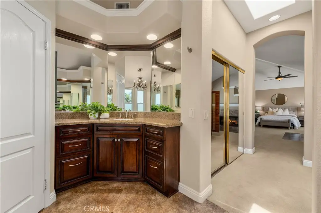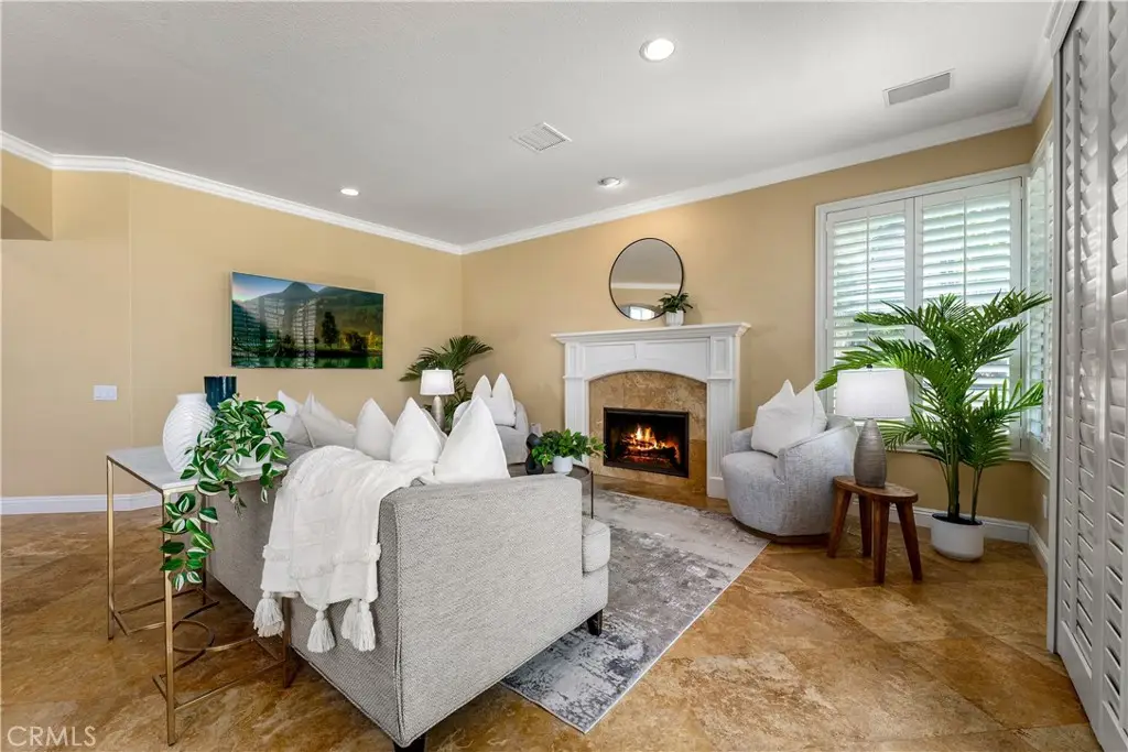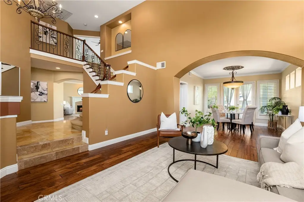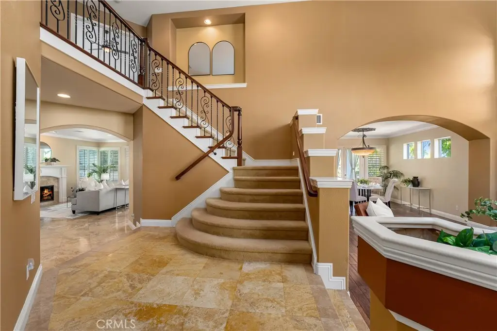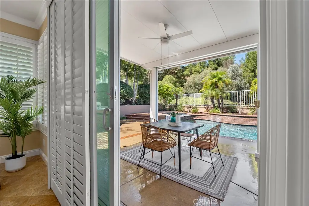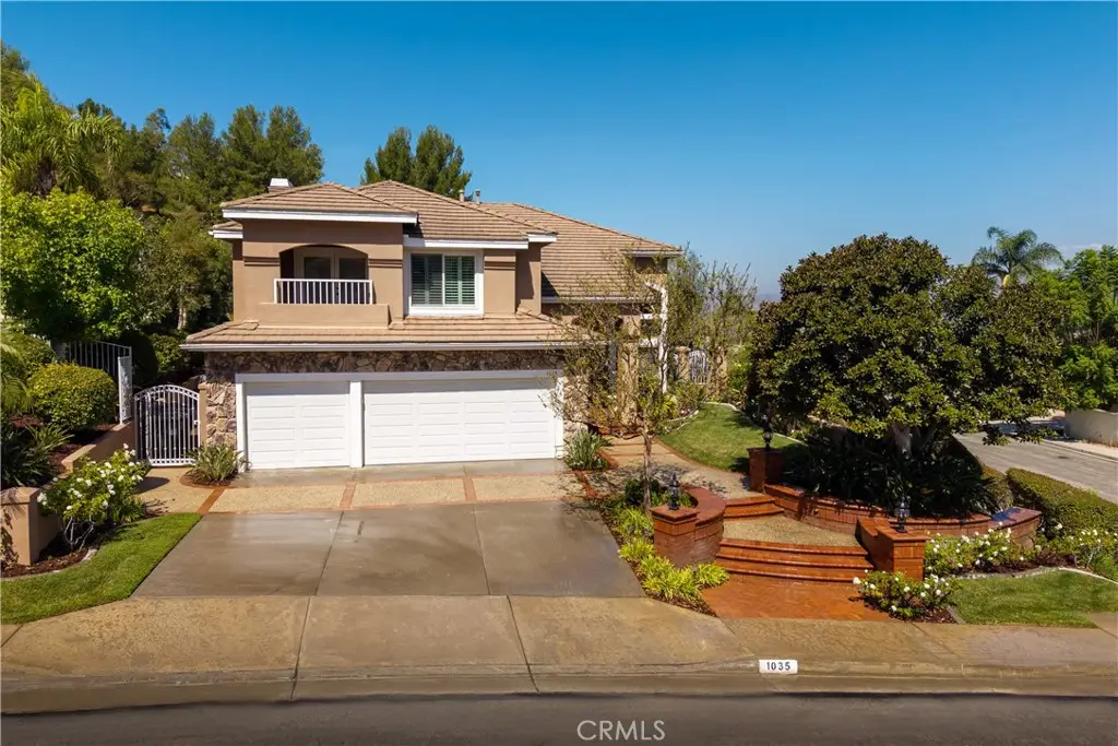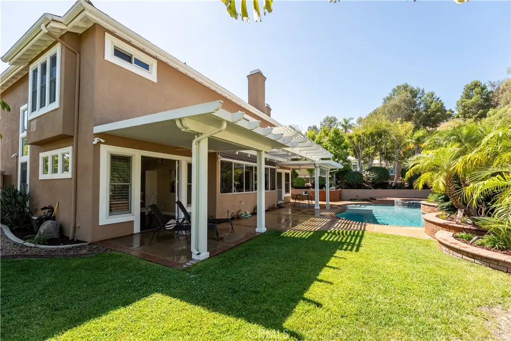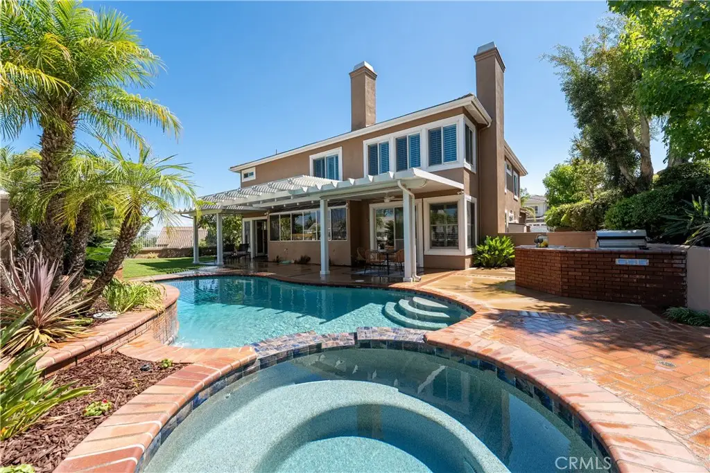 Step into a world of elegance and comfort at this stunning 5-bedroom, 4.5-bathroom pool home with partial views, perfectly located in the heart of Anaheim Hills. From the moment you enter through the double doors into the grand foyer beneath a sparkling chandelier, this home makes a lasting impression. To your right, the formal living room sets the tone with rich wood floors that flow seamlessly into the dining room, where French doors invite you to step outside and enjoy the beauty of the backyard. Wood shutters, crown moldings, and timeless design details add warmth and sophistication throughout. At the heart of the home, the expansive kitchen is designed for both daily living and entertaining. Granite countertops, stainless steel appliances, built-in refrigerator, 5-burner cooktop, and walk-in pantry provide everything a chef could want. The oversized bay window floods the space with natural light while overlooking the sparkling pool. Just beyond, the inviting family room with fireplace offers the perfect place to gather, with sliding glass doors leading to the backyard oasis. A main floor bedroom with en-suite bath offers flexibility for guests or a home office, while a separate powder room adds convenience. Upstairs, the primary suite is a private retreat all its own. Double doors open to a spacious sanctuary with fireplace, sitting area, infrared sauna, dual walk-in closets, and spa-inspired bath with dual sinks, walk-in shower, and jetted tub. Three additional bedrooms complete the upper level--two connected by a Jack & Jill bath, one with a balcony to enjoy evening breezes, and another with a large walk-in closet and mirrored wardrobe doors. The backyard is truly the soul of this home--a resort-style haven where every detail is designed for entertaining and relaxation. Multiple Alumawood patio covers with ceiling fans and lighting create the perfect setting for outdoor dining. A built-in BBQ makes weekend gatherings effortless, while the pebble tek and salt water pool and spa invite endless hours of fun and tranquility. Additional features include updated stair railings, plantation shutters throughout, water softener and purifier, whole-house fan, crown molding and so much more. This home is more than a place to live--it's a lifestyle. With its perfect blend of luxury and warmth, it's ready to welcome you home.