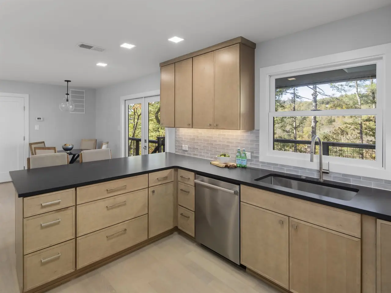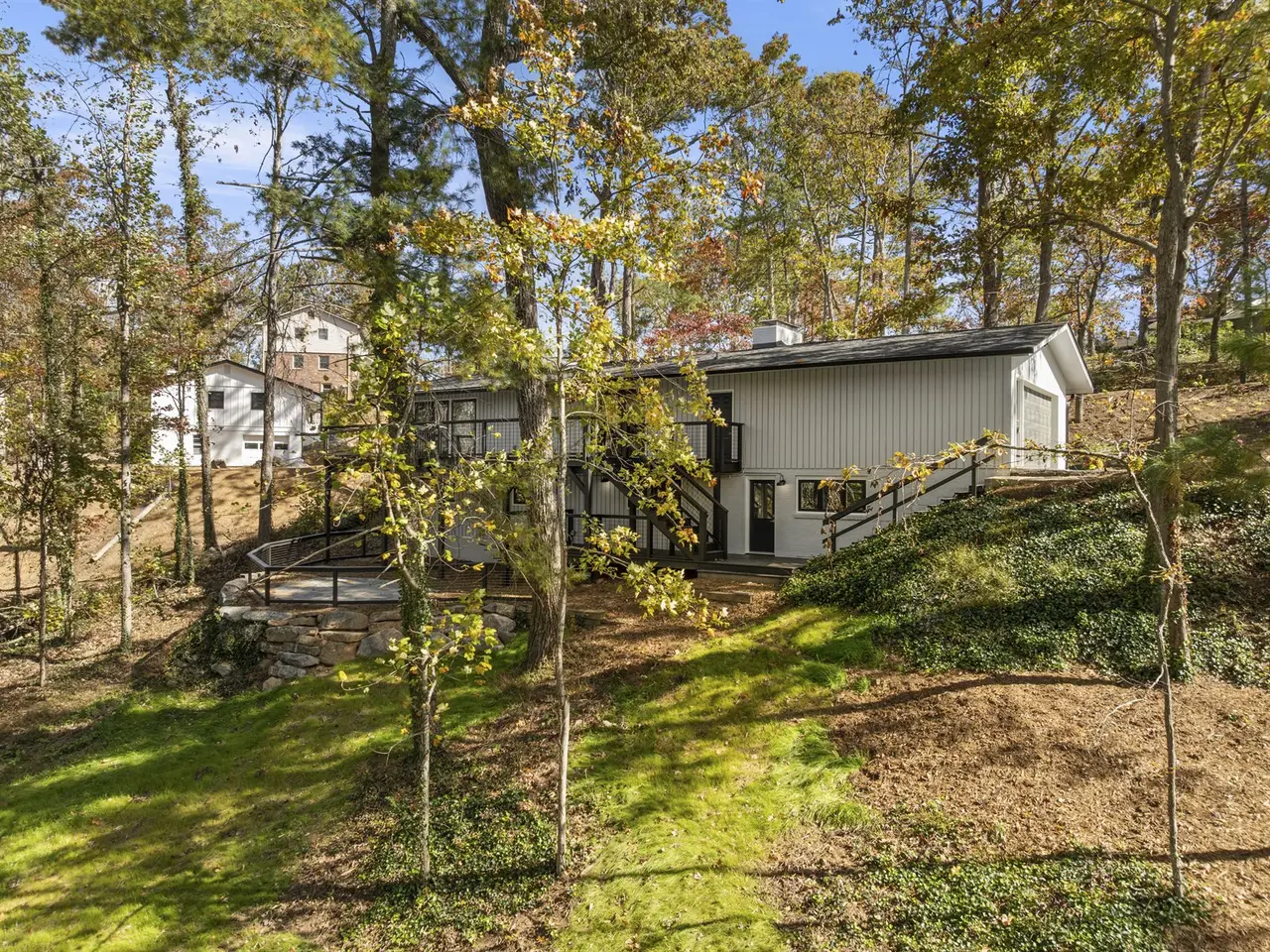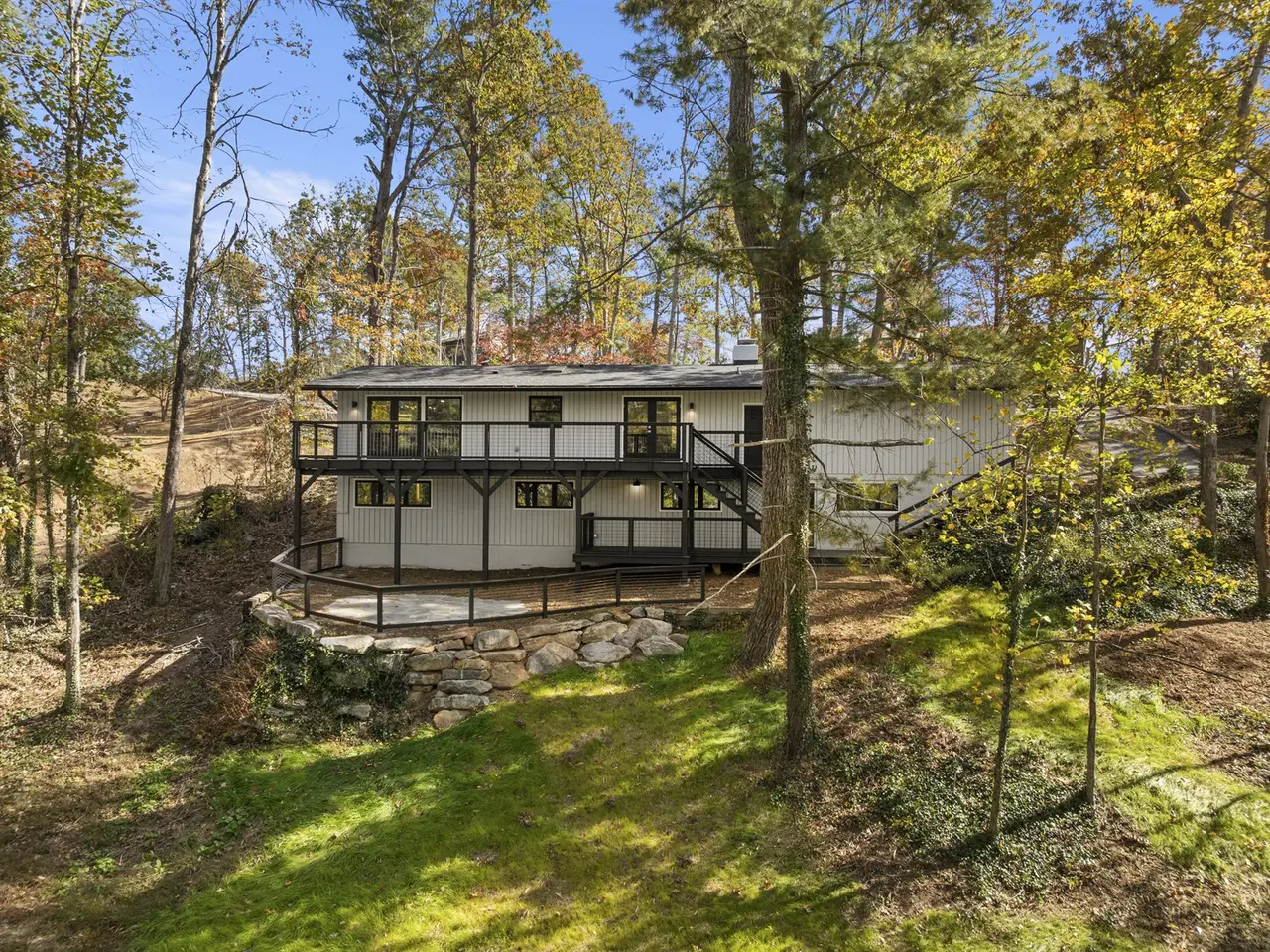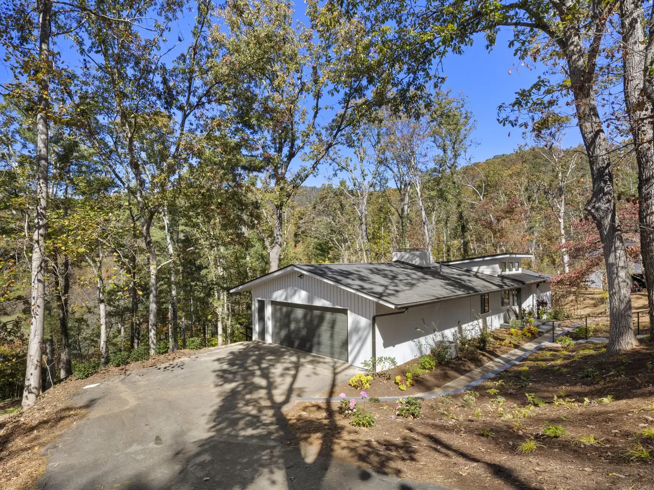 Modern luxury awaits in this meticulously renovated home nestled in peaceful Kimberly Woods. Originally built in the 1960s, this North Asheville gem has been completely reimagined to offer the sophistication and comfort of today's finest homes - at a value you won't find anywhere else in the area. Behind a sleek five-panel mid-century door, a sun-washed foyer with soaring ceilings and skylights hint at the contemporary style awaiting further inside. To your right, a formal sitting and dining room offers an elegant setting for gatherings. The sleek kitchen is a showstopper, featuring brand-new cabinetry, Corian countertops, stainless steel appliances, and a charming breakfast nook that's perfect for morning coffee or casual meals. Rounding out the main level, a comfortable living room centers around an original brick, wood-burning fireplace, creating the perfect place to unwind with a good book. Retreat to the terrace level and discover a true sense of privacy and calm. Here, the primary suite impresses with a sophisticated ensuite, joined by two inviting guest rooms and a versatile den ideal for movie nights or creative pursuits. Enjoy the outdoors with a versatile outdoor living space, featuring dual-level decks with mountain views, a stone patio perfect for a fire pit, and a gently contoured yard enveloped by mature trees. Just minutes from downtown Asheville, this home skillfully balances quiet neighborhood charm with easy access to renowned restaurants and shopping.