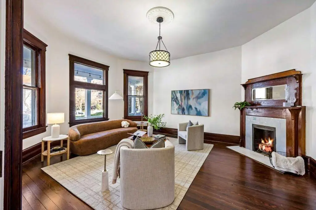Timeless Victorian home situated among treelined streets and welcoming sidewalks. Built circa 1896, the home has been impeccably restored and maintained. Original period details blend seamlessly with modern updates, ensuring both historic charm and contemporary comfort. Soaring 11-foot ceilings, original hardwood floors, and stately trimmed windows create a warm and inviting ambiance, while picture rail molding and intricate ceiling medallions add timeless character. The home's rocking chair front porch-framed by a classic picket fence and seasonal blooms set the stage for neighborly chats and peaceful mornings. Once inside the grand foyer showcases the elegant main staircase, leading into the front living room with double pocket doors opening to a formal dining space that has hosted cherished gatherings for decades. Original working fireplaces in both rooms enhance the home's historic charm. A modernized full bath on the main level boasts an original clawfoot tub, floor-to-ceiling windows, and an electric shade for privacy. The kitchen is outfitted with stainless appliances, white quartz countertops and backsplash, and a striking original brick wall behind the Thermador six-burner range with vented hood. KitchenAid 48-inch side-by-side refrigerator/freezer, a white farmhouse sink, and an eat-in sitting area with coffered ceiling and French doors to the back deck make this space both functional and inviting. A large laundry room/pantry provides additional convenience, with a second stairwell leading to the second level. Upstairs, the charm continues with soaring 10-foot ceilings and an elegant curved-edge wall. The primary suite is a true sanctuary, boasting a third working fireplace, two closets, and a spa-inspired rain shower with multiple showerheads, and a built-in bench for ultimate relaxation. The second bedroom has a decorative fireplace, walk-in closet, and nook for desk with a hall bathroom just across the hall. The third bedroom also features a decorative