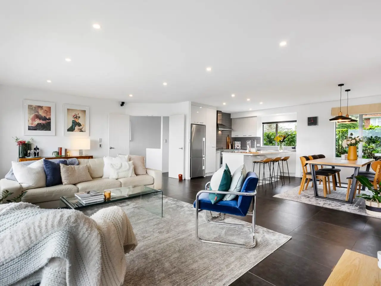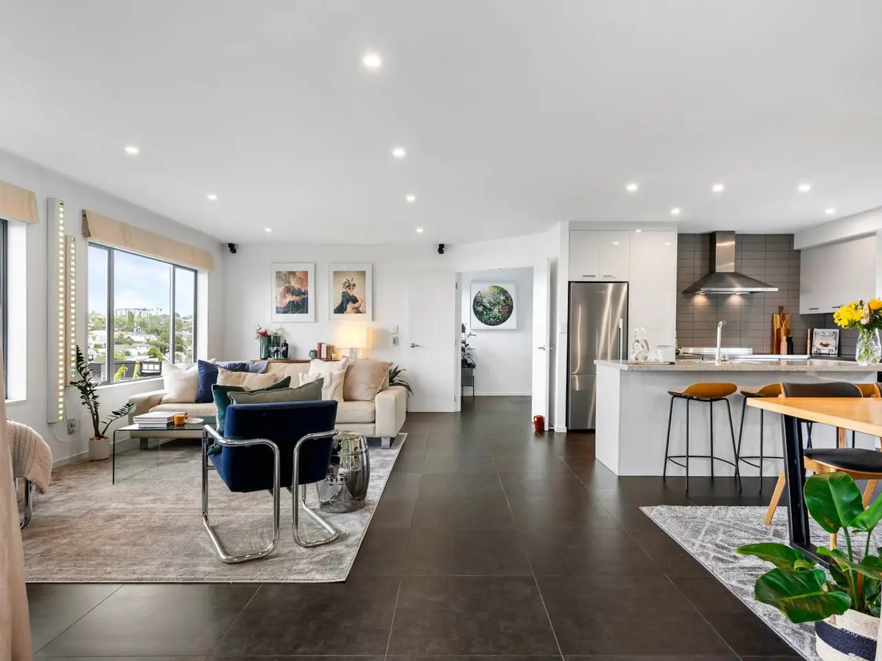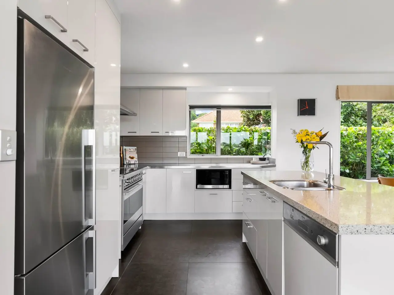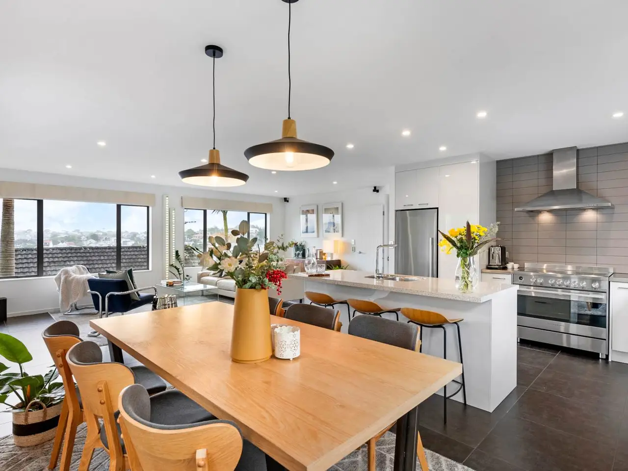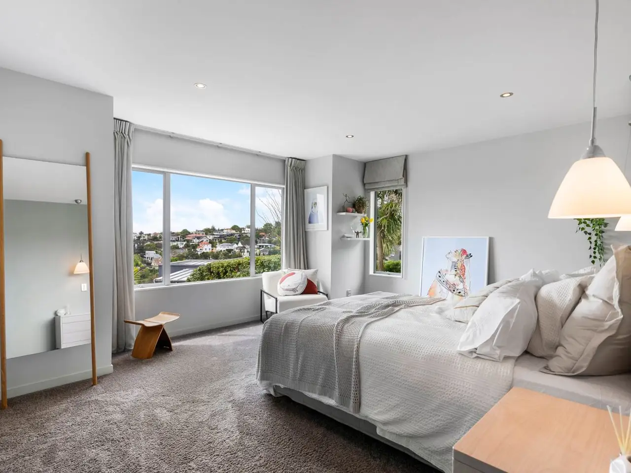 Tucked privately on a rear section, this lofty brick and weatherboard residence enjoys tantalising glimpses of the Waitemata Harbour, and the surrounding urban landscape. Towering Nikau palms and lush tropical foliage create a private, tranquil setting within an exclusive coastal enclave, just an easy walk to Mission Bay's iconic shoreline, cafés, and beaches.A thoughtful 211sqm (approx.) floor plan positions all north-facing living on the upper level, capturing abundant natural light, expansive urban vistas, and shafts of water views. Aluminium joinery enhances comfort throughout generous open plan living and dining areas that connect seamlessly through bifold doors to a substantial covered loggia with built-in seating. The contemporary kitchen features stainless steel appliances, stone-topped island, and ample storage, creating an ideal hub for everyday living and entertaining.Carpeted double bedrooms include a serene upper-level main suite with heat pump, monochrome ensuite, and extensive built-in wardrobes. A fifth bedroom downstairs offers versatility as a second lounge, complemented by a large family bathroom with sleek black fixtures, freestanding bath, and modern vanity. Two powder rooms, one on each level, enhance convenience. The carpeted internal-access double garage incorporates laundry and storage, with additional off-street parking and low-maintenance garden pockets ideal for alfresco dining. Close to city commuter routes, Orakei School, in-zone Selwyn College, and Eastridge's shops and eateries, this secluded coastal haven delivers relaxed, resort-style living just moments from the beach. Auction: 34 Shortland Street, City on Wednesday 19 November 2025 at 10:00AM (unless sold prior)