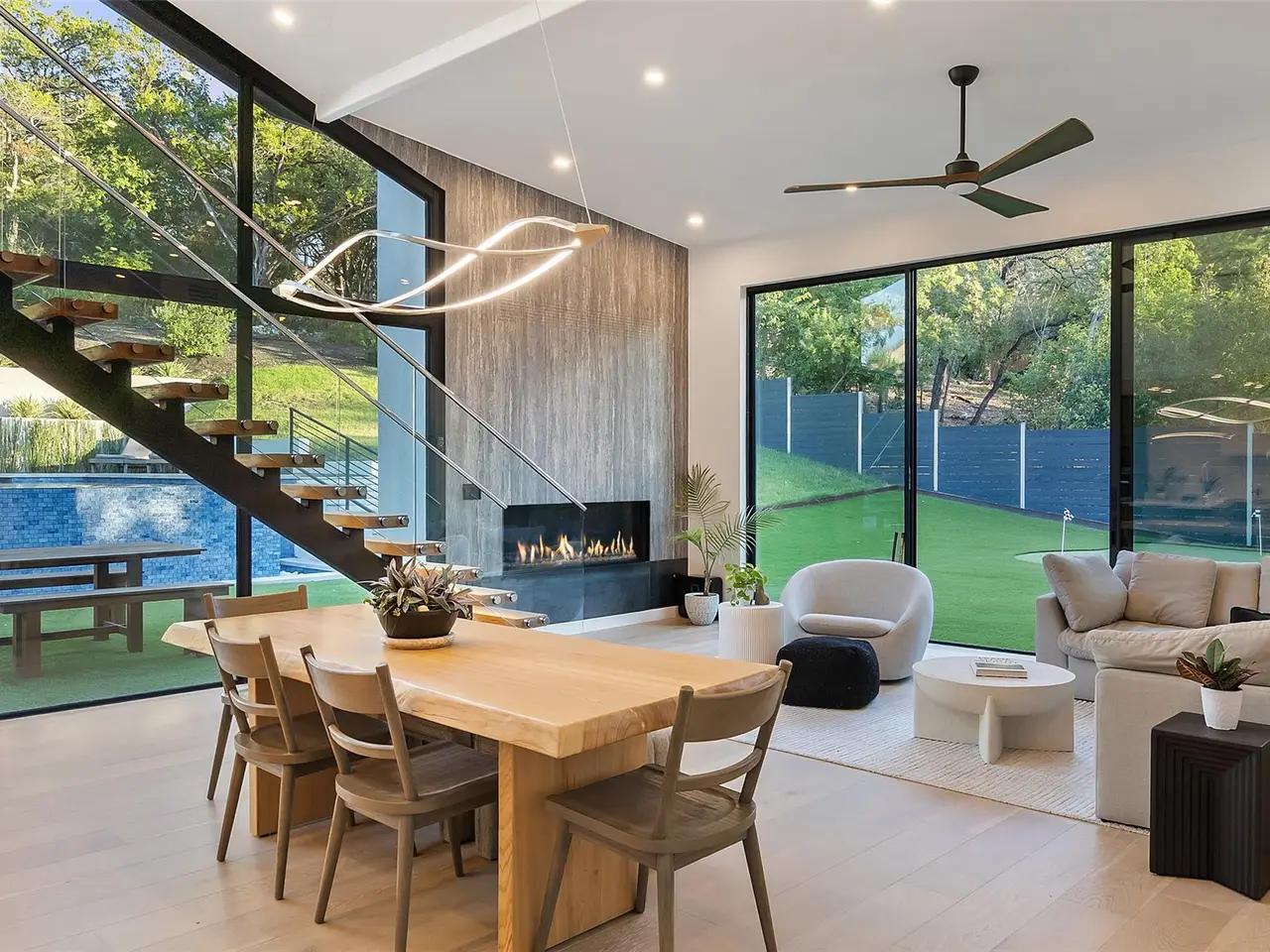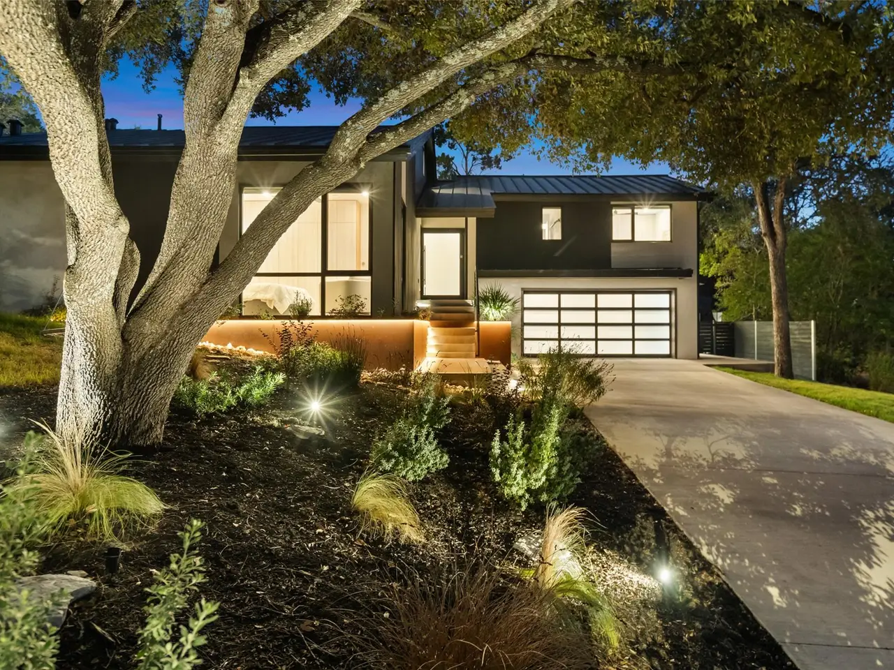 Welcome to 2503 Dip Cove in Barton Hills, a modern forever home designed by Garwood Architecture and built by Petrini Custom Homes. Set on a quiet cul-de-sac on nearly half an acre, this five-bedroom, four full and two half-bath residence offers 3,510 square feet of refined living with an emphasis on craftsmanship and enduring style.Inside, wide-plank French white oak floors and floor-to-ceiling windows create bright, airy interiors. A sculptural staircase anchors the open-concept living area, while 10' Western sliding doors extend the main level to a generous outdoor terrace. The chef's kitchen features a waterfall-edge quartz island, Miele appliances, and an integrated wine fridge, which flows seamlessly into the dining and living spaces centered around a 72" travertine-wrapped modern fireplace.The primary suite is privately located in its own wing and offers a spa-inspired bath with Kallista touchscreen controls, dual rainfall showers, and a sculptural soaking tub. A boutique-style wardrobe and independent climate system enhance comfort. Four additional bedrooms include integrated storage, with two ensuite baths. A two-story guest apartment provides a secondary primary suite, prep kitchen, living area, and private entrance.Outdoors, resort-style amenities include a 20' x 40' infinity pool, integrated spa, eight-seat sauna, outdoor shower, and putting green. A pre-designed 1,100-sqft cabana offers potential for a gym, studio, or entertainment pavilion. Terraced landscaping and LED lighting elevate the setting after sunset.Additional features include an integrated Apple Home system, home water filtration, three HVAC units with dehumidifiers, dual tankless water heaters, and a 12-zone irrigation system. Private, quiet, and meticulously crafted, this home offers modern luxury in one of Austin's most desirable neighborhoods.