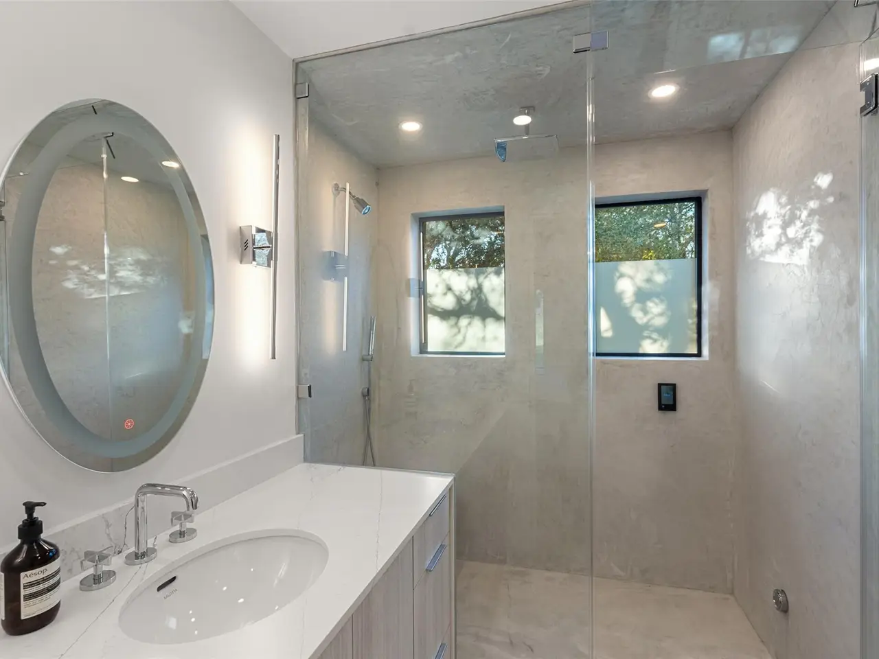 Spa-inspired bath with dual rainfall showers