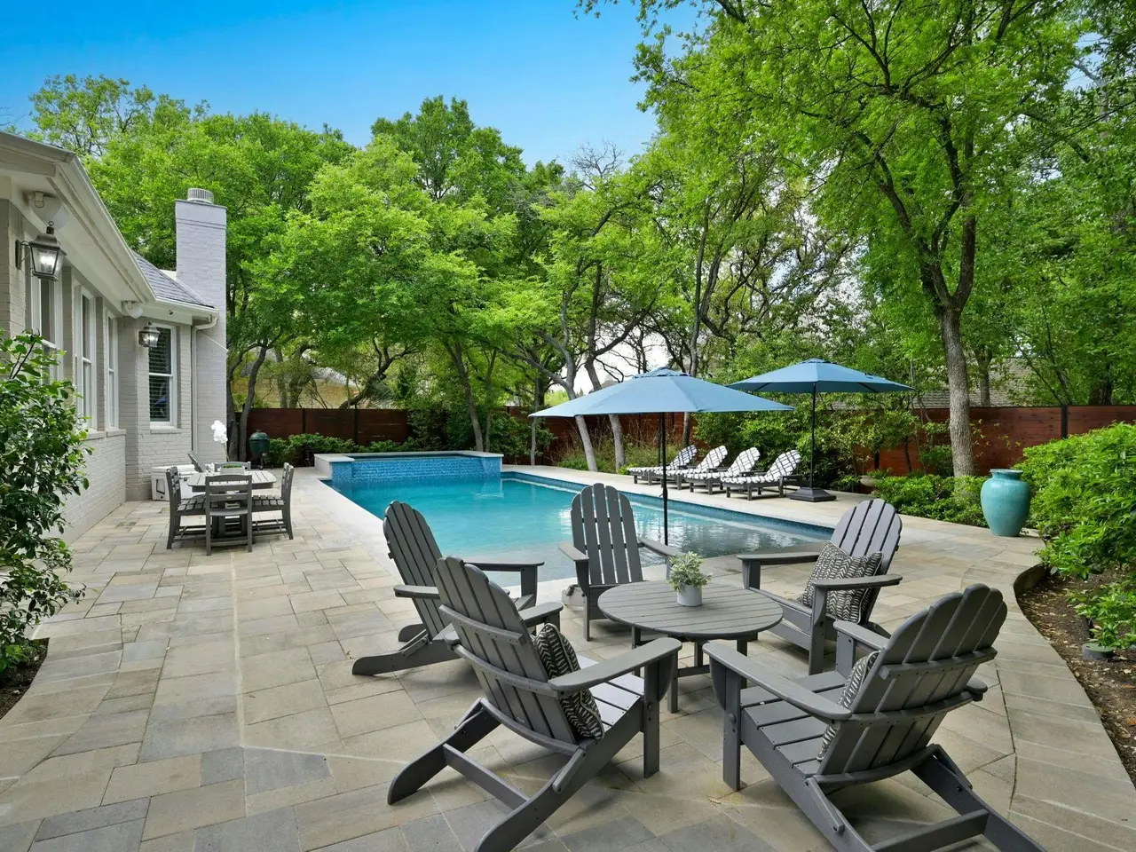 The private backyard is a true oasis, featuring a beautiful Westbank pool and spa surrounded by lush landscaping, perfect for cooling off on hot Austin summer days.