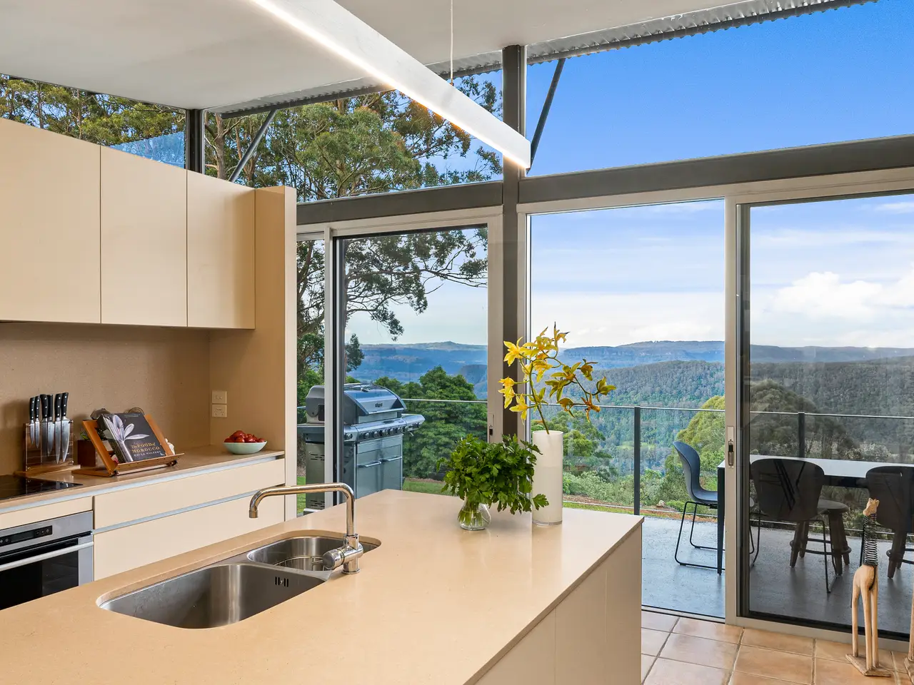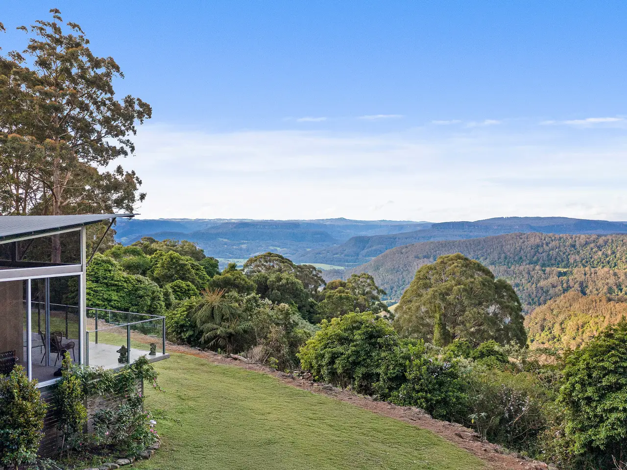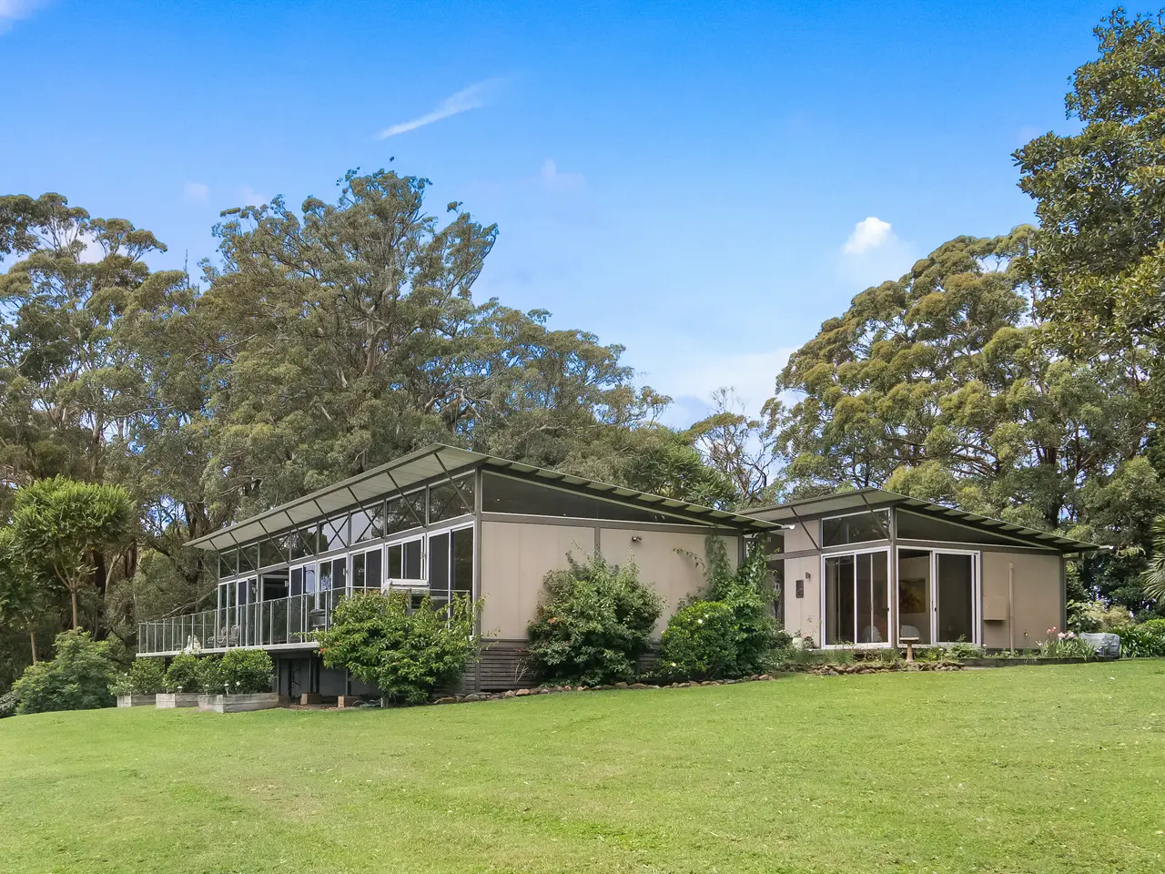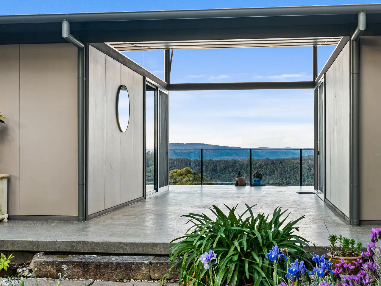 Rising high above the valley, this pavilion-style retreat reveals complete privacy and breathtaking 360-degree views spanning the escarpments, rolling countryside, and the distant waters of Jervis Bay and the Shoalhaven. Designed as an atrium of light, the home's walls of glass sliding doors dissolve the boundaries between indoors and out, framing an ever-changing panorama from sunrise to sunset. Facing northeast and above the frost line, the property enjoys full winter sun for year round warmth. The open-plan main pavilion flows from the sleek kitchen to the dining and lounge spaces, all connecting to surrounding walkways. All three bedrooms each occupy private pavilions complete with ensuite bathrooms, underfloor heating, and reverse-cycle air conditioning, while the main bedroom enjoys a front-row seat to the valley vistas. Beyond the residence, the almost three-hectare estate is enveloped by ancient eucalypts, towering Moreton Bay figs, and flourishing gardens, featuring rose beds, a productive orchard, and banks of gardenias, camellias, and hydrangeas. Positioned at the end of Tourist Road, this estate offers privacy without isolation, with Berry and Kangaroo Valley both just 15 minutes away and Bowral reachable in 40. Its elevated position delivers spectacular scenery in every direction, creating a truly unique and tranquil retreat. • Pavilion-style home on 2.79 hectares with 360-degree valley-to-coast views • Walls of glass sliding doors create a unique indoor-outdoor connection • North-east facing and above the frost line, enjoying full winter sun • Open-plan main pavilion with kitchen, dining, and lounge, with a fireplace • Three private bedroom pavilions, each with an ensuite • Potential for two more rooms to be created under the roof line • Underfloor heating and reverse-cycle air conditioning in every room • Convenient office space, carport, and shed for added functionality.