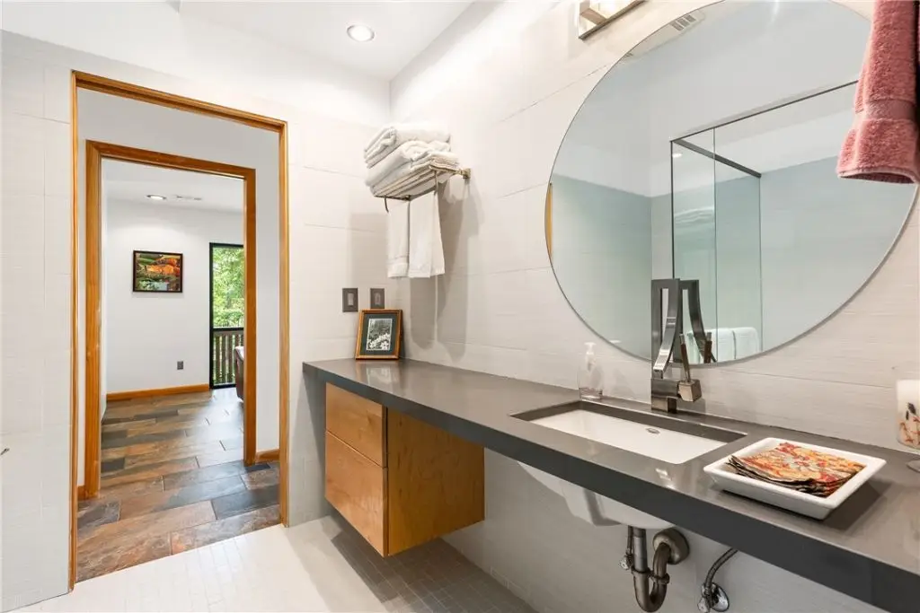 Less than mile from Coler Mountain Bike Preserve. The acres have open space, lots of trees, firepits, decks, patios; property feels like a retreat; peaceful/setting. From indoors, nature is appreciated because of large windows & skylights. Main living space is large/open; allows versatility to furnish for a preferred lifestyle; whether to use the space for large sofas & chairs, dining areas, game tables, piano, or other furnishings. There is a lot of minimalist style cabinetry throughout the home with clean lines and a focus on simplicity & functionality that creates a calm and uncluttered environment. A safe room (565 sq.ft.) is in the lower level. Home also has a sauna. The location adds much value to this property. It is a rural setting where homes have large lots, yet just a few minutes to Bentonville Square, Museums, Walmart Home Office, and many trails. There is a 1500 sq.ft. heated/cooled 2-level shop with car lift & other equipment. There's a generator for the full house & shop with 1000 gallon propane tank