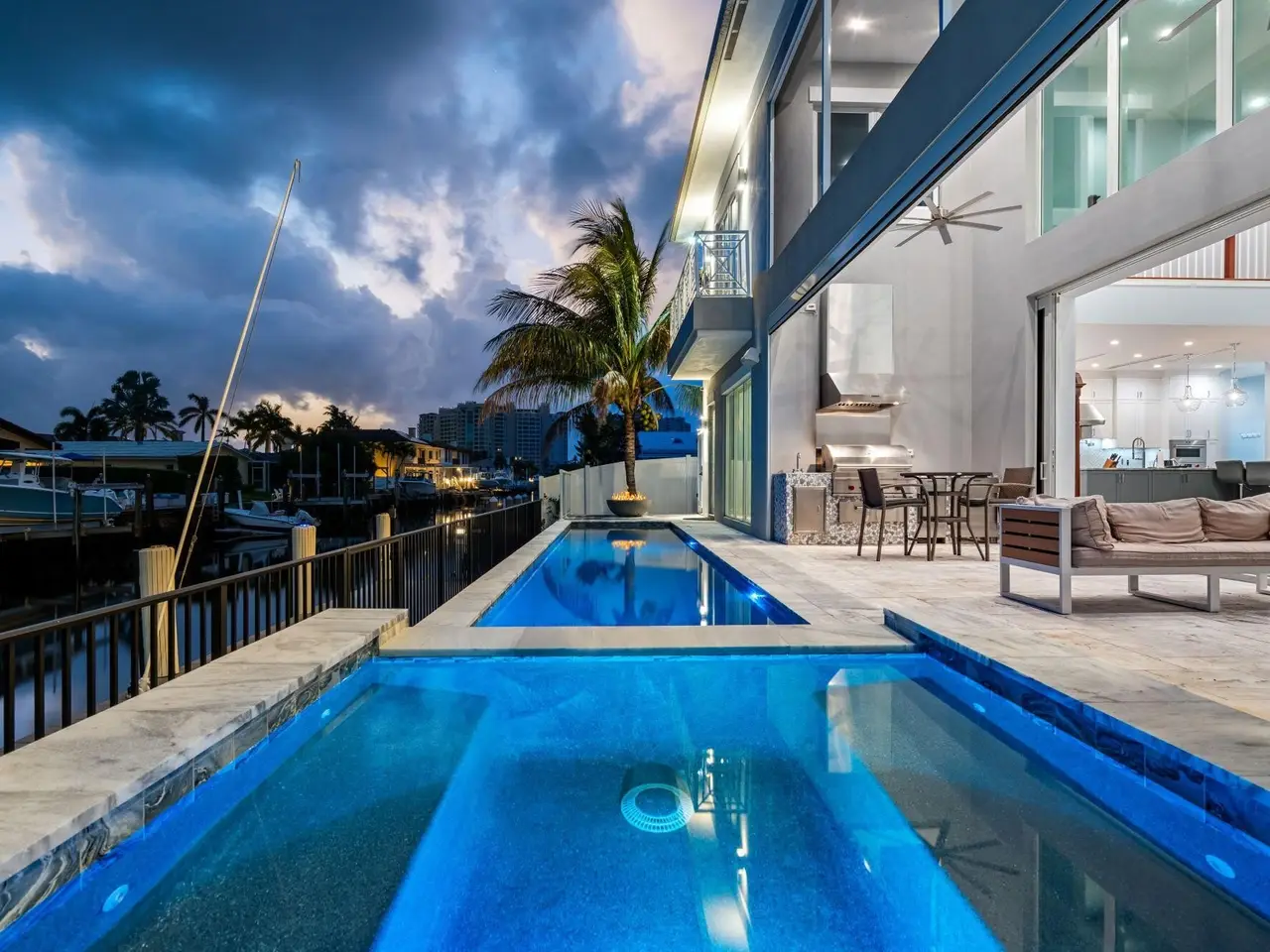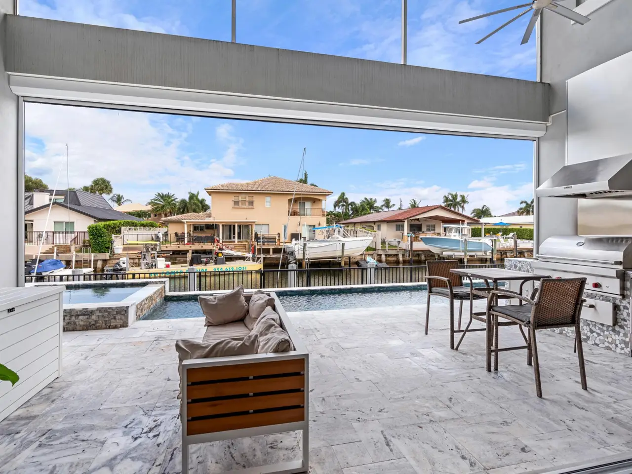 807 Dover Street, a 2021 custom built in Boca Raton's exclusive Bel Marra on 85+/- feet of waterfrontage, and direct ocean access with no fixed bridges, which offers a seamless blend of contemporary and classic design. Inside, high ceilings and premium finishes define the open, light-filled spaces. The chef's kitchen features high-end appliances with natural gas and is complemented by a dedicated wine room. The primary suite, located on the main level, overlooks the waterfront. A private elevator accesses the second floor, which includes a VIP suite and three additional guest rooms. Outside, sliding glass doors open up to the lanai with a remote phantom screen feature and summer kitchen. The property boasts a resort-style pool and spa.
