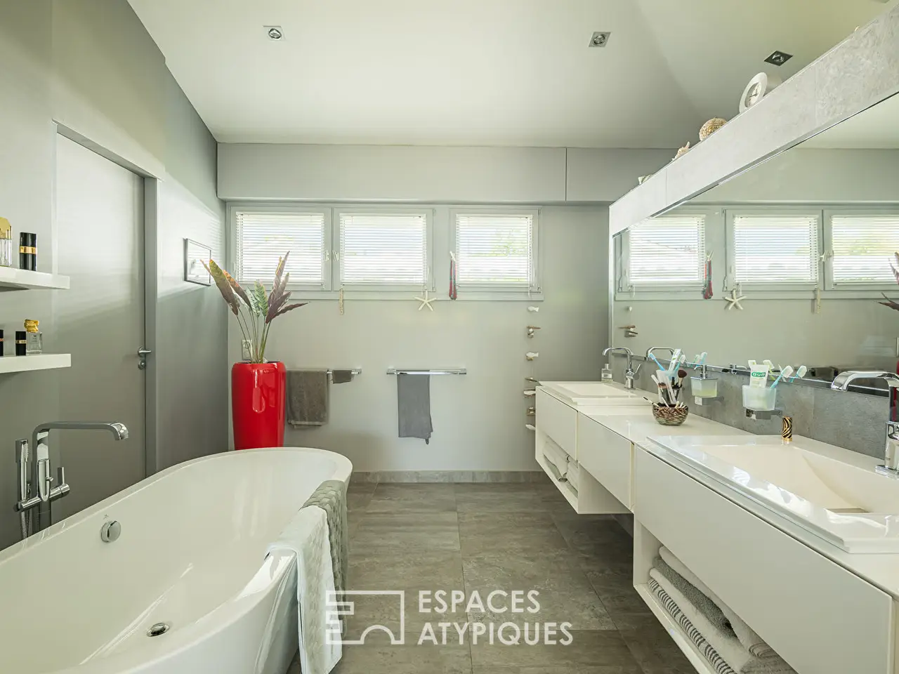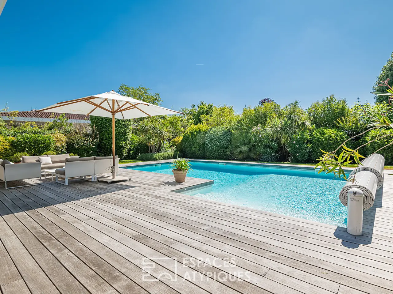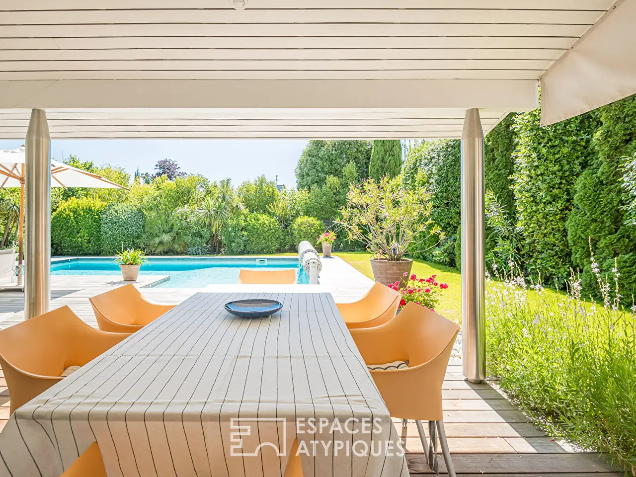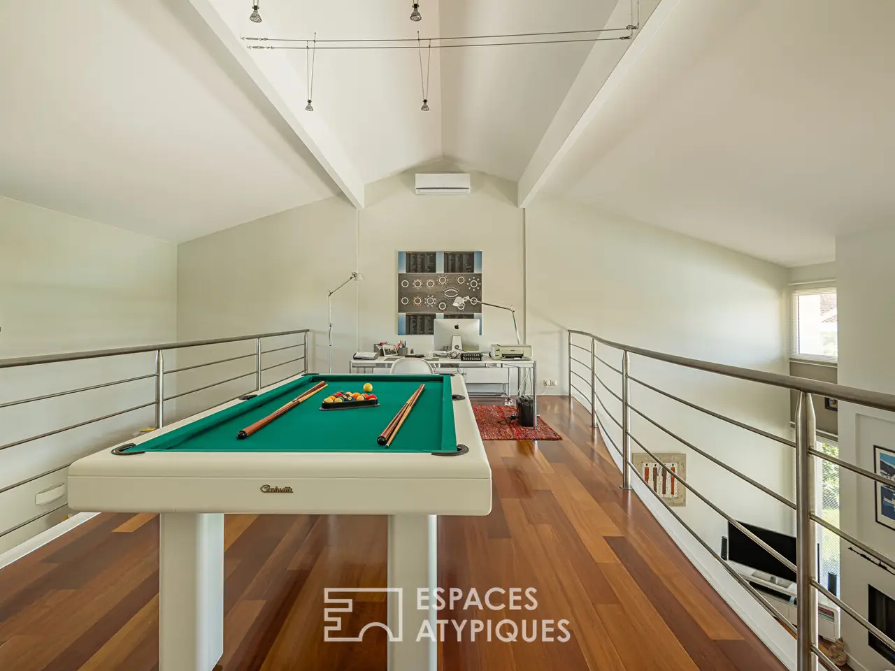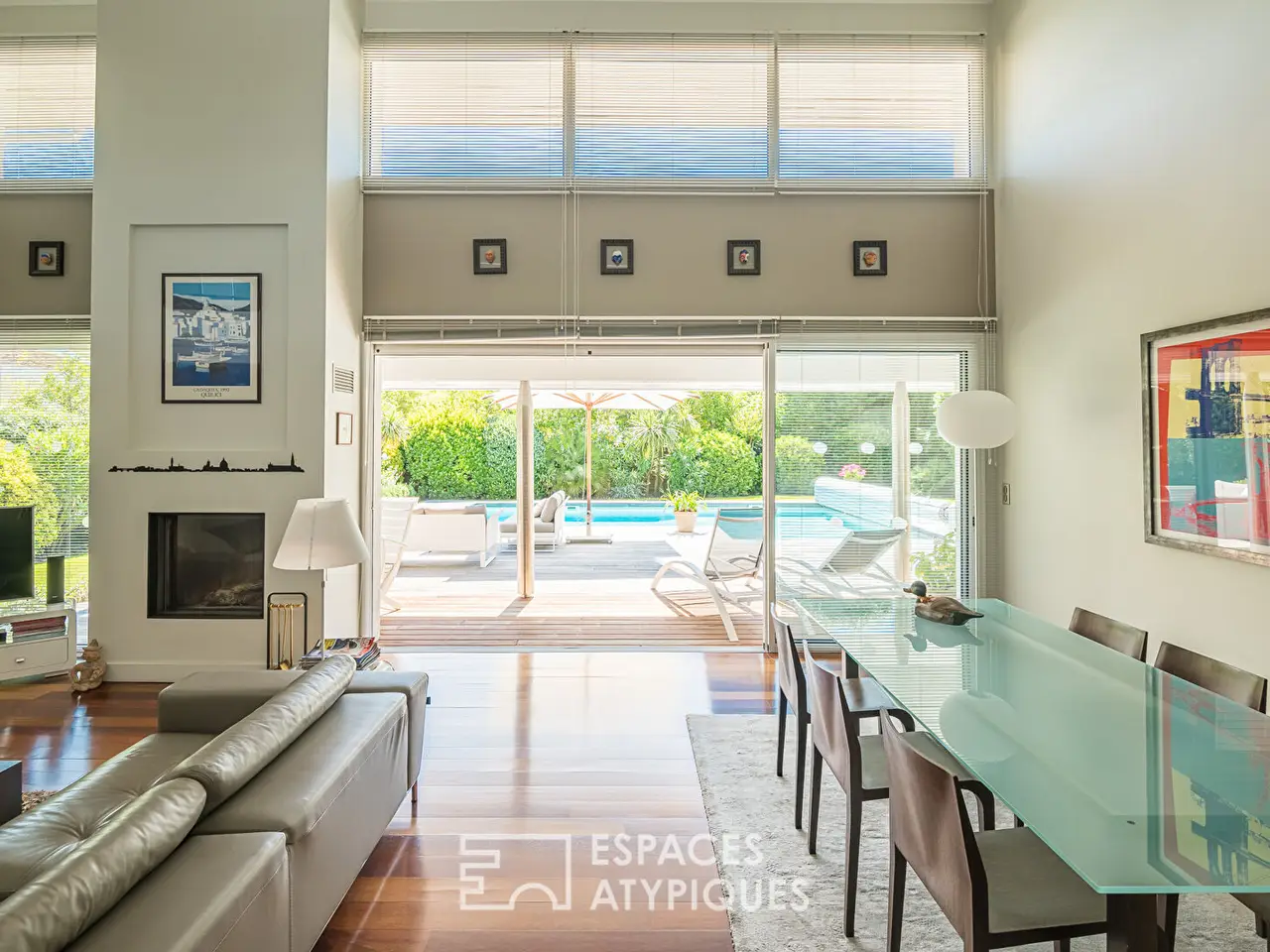 Immerse yourself in the luxury and tranquility of this magnificent 200 sqm architect-designed house, located in the heart of a vast, carefully landscaped garden. This unique property combines modern elegance, comfort and privacy. Upon entering, you will be greeted by a large entrance hall with plenty of practical storage space and a WC, offering a functional and well-designed space. The large living room is the heart of the house. It is decorated with a contemporary fireplace and opens onto the garden through large full-height bay windows, allowing natural light to bathe the interior while offering a breathtaking view of the green garden. The Bulthaup kitchen, independent and fully equipped, is accompanied by a laundry room and an adjoining pantry, providing additional storage space and facilitating daily organization. The expansive, single-storey master suite includes a large walk-in closet and en-suite bathroom with shower and bath, providing a luxurious and intimate relaxation space. Upstairs, a mezzanine overlooks the living room, adding a unique architectural touch and allowing access to two additional bedrooms. They share a bathroom with WC, offering comfort and practicality for residents or guests. Outside you will find a parking space on the front plot as well as a large double garage, providing convenient and secure parking solutions. The landscaped garden is a true green setting, with a heated swimming pool not overlooked, perfect for moments of relaxation and swimming in complete privacy. This architect-designed house is a jewel that combines modernity, comfort and nature, offering an exceptional living environment for those looking for an elegant and peaceful residence. ENERGY CLASS: C / CLIMATE CLASS: C. Estimated average amount of annual energy expenditure for standard use, established based on energy prices for the year 2021: between 1300 and 1820 euros. Additional information * 4 rooms * 3 bedrooms * 1 bathroom * 1 bathroom * Floor : 1 * Outdoor space : 700 SQM * Parking : 1 parking space * Property tax : 3 614 €