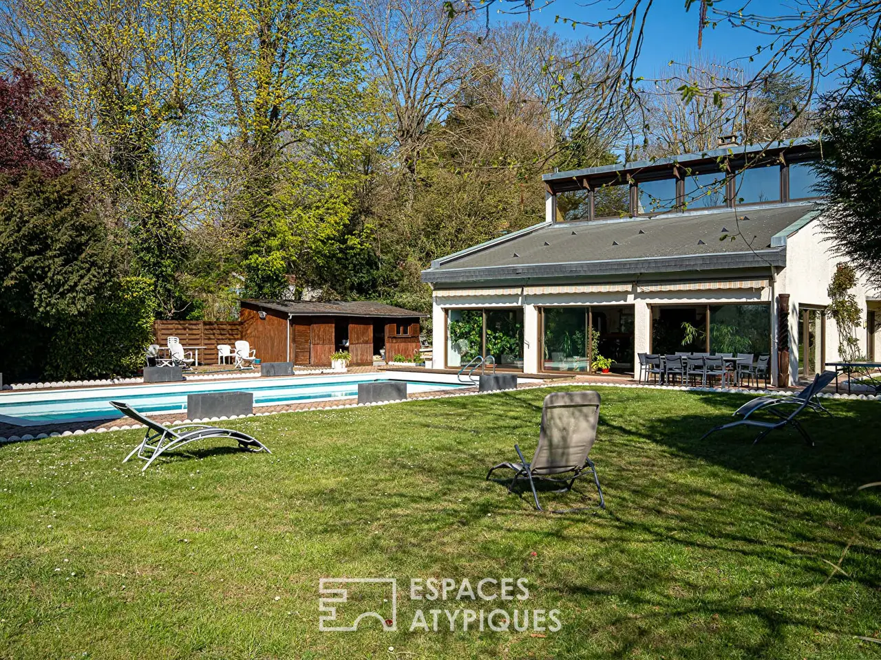 This superb, atypical house of 977 sqm on the ground, built in the 80s on a plot of 2800 sqm offers exceptional volumes and can accommodate a large family or combine a liberal or commercial activity.Nestled on the heights of Bougival, without any vis-a-vis and sheltered from view, it combines absolute calm and generous spaces, only a few minutes from amenities and transport.With a surface area of 753 sqm, this residence is distinguished by its unique architecture and impressive volumes.The vast living room of 105 sqm, bathed in light thanks to its large openings, opens directly onto the landscaped garden and the 14x6m outdoor swimming pool. Its fireplace and its sunken lounge area assume the architectural style of the house.The kitchen of 28 sqm with central island and dining area is in keeping with the surfaces and volumes of the house.The master suite is not to be outdone, nestled at the end of the house, it offers a 36 sqm bedroom overlooking the garden, a 14 sqm bathroom, a dressing room or office as well as a separate toilet.A second 22 sqm bedroom overlooking the garden, a bathroom with toilet complete this level.A 75 sqm mezzanine overlooks the living room with a space suitable for a games room and/or TV lounge, and distributes three beautiful bedrooms each with their own bathroom.A staircase from the mezzanine offers a remarkable view of the valley.The basement of the house communicates under the garden to offer large openings on the lower level, below. A gym with sauna and a dance room take advantage of the portholes of the swimming pool. A home cinema or nightclub room, a large cellar, and a large storage room are distributed by large corridors, at the end of which three large bedrooms or offices of 17, 17, and 32 sqm open through large bay windows onto the garden below.A 38 sqm studio has also been placed there. A bathroom, a shower room, and a toilet complete this level.The 124 sqm garage and workshop can accommodate up to 7 cars.A refresh of the house will be necessary to bring it up to date and exploit its full potential.Bougival train station (Line L) is only a five-minute drive away and provides access to La Defense in fifteen minutes.Access to the A86 and A13 facilitates travel to Paris and Versailles.Several renowned educational establishments are also located just minutes away, including the British School in Croissy sur Seine, the Ermitage International School and the Lycee International de Saint-Germain-en-Laye.ENERGY CLASS: D / CLIMATE CLASS: DEstimated average annual energy expenditure for standard use, based on energy prices for the year 2021, 2022, 2023: between EUR9,630 and EUR13,090.REF. 10414Additional information* 17 rooms* 9 bedrooms* 2 bathrooms* 4 shower rooms* Outdoor space : 2773 SQM* Parking : 9 parking spaces* Property tax : 9 100 €Energy Performance CertificatePrimary energy consumptiond : 157 kWh/m2.yearHigh performance housing*A*B*C*157kWh/m2.yearD*E*F*GExtremely poor housing performanceEstimated average annual energy costs for standard use, indexed to specific years 2021, 2022, 2023 : between 9630 € and 13090 € Subscription IncludedAgency feesThe fees include VAT and are payable by the vendorMediatorMediation Franchise-Consommateurswww.mediation-franchise.com29 Boulevard de Courcelles 75008 ParisInformation on the risks to which this property is exposed is available on the Geohazards website : www.georisques.gouv.fr