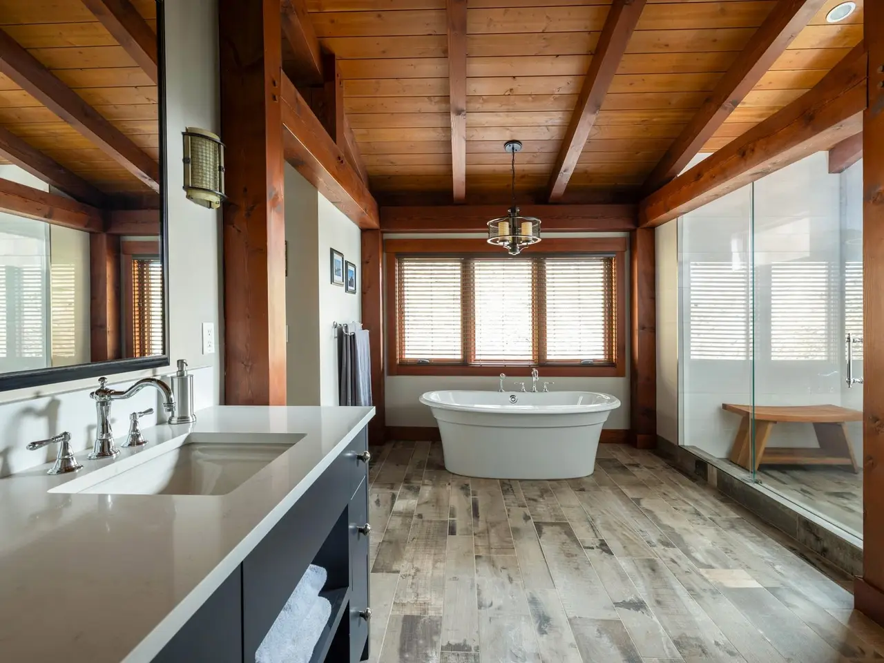 Main level primary bedroom with cathedral timberframe ceilings