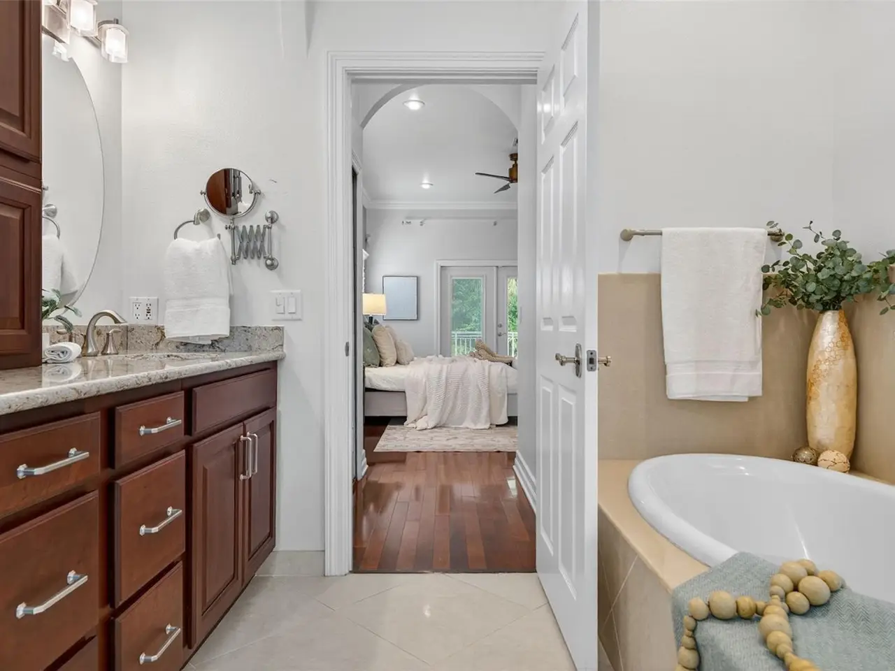 - Rich wood floors and crown molding throughout