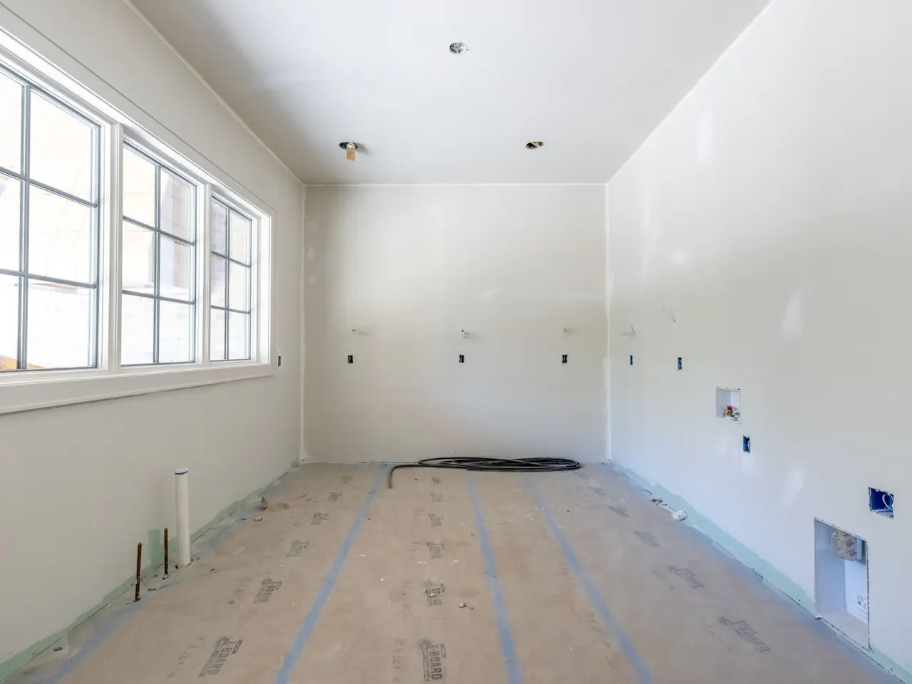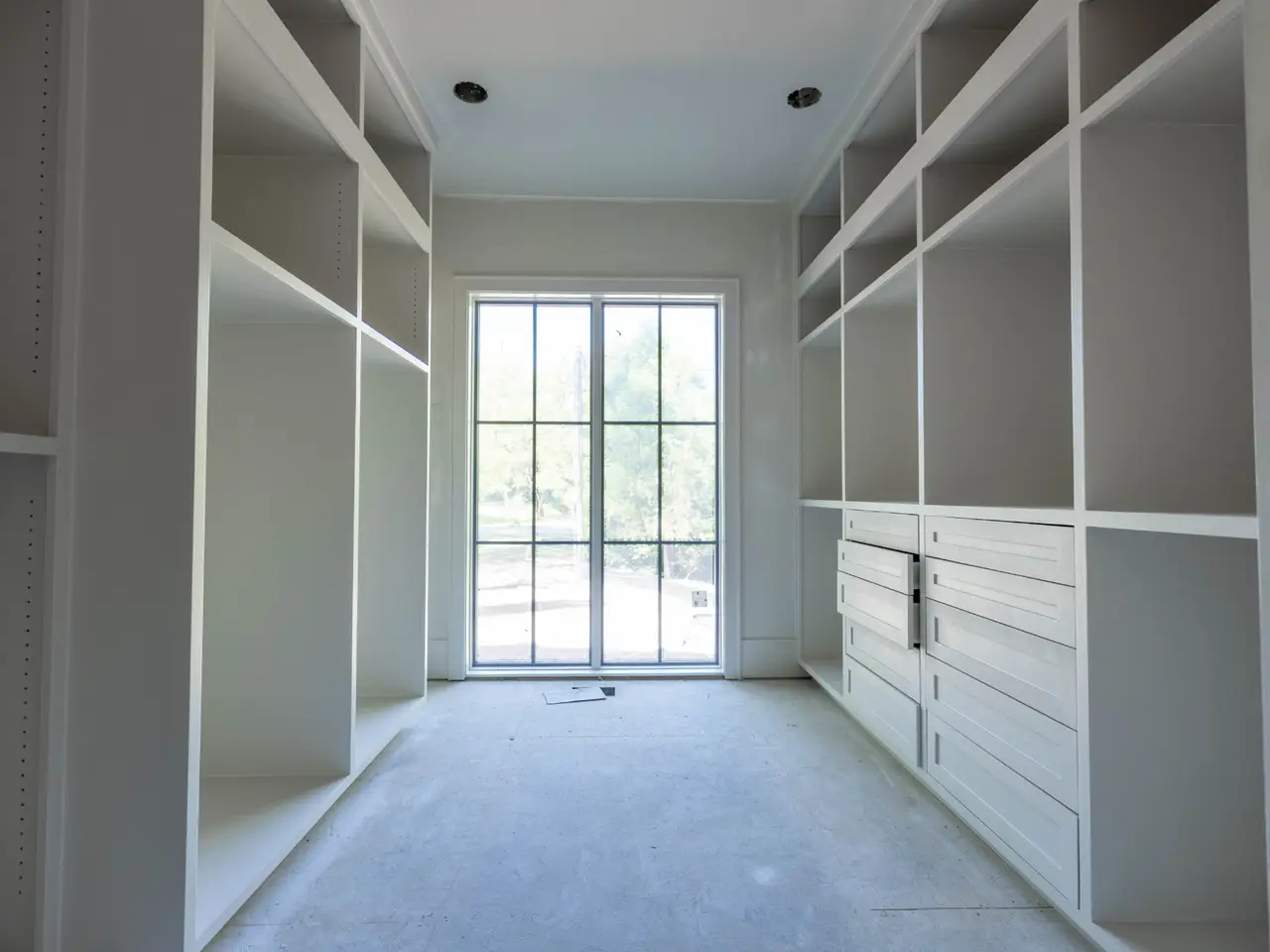 The main-level primary suite is a true oasis, featuring dual walk-in closets--one with a private washer and dryer--a spa-inspired bathroom with a large soaking tub, separate shower, and dual vanities. A dedicated home office with built-in cabinetry, shelving, and a gas fireplace creates a warm, sophisticated workspace.
