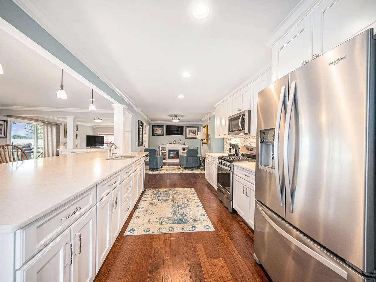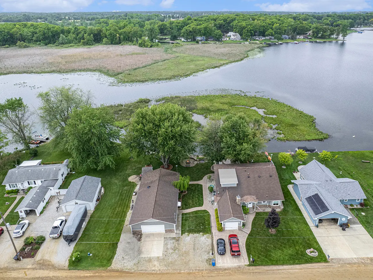 Experience the pinnacle of waterfront luxury in this stunning 4-bedroom, 2-bathroom lakefront estate. Nestled on a pristine shoreline where you can watch nesting swans, this home boasts breathtaking panoramic views through a full wall of floor-to-ceiling windows, flooding the open-concept living space with natural light. The heart of the home is a massive chef's kitchen featuring high-end appliances, custom cabinetry, and expansive Quartz countertops, perfect for entertaining or quiet mornings with a view. A grand dual staircase makes a striking architectural statement and leads to generously sized bedrooms designed for comfort and style. The upstairs bathroom is a true spa-like retreat, complete with heated floors for year-round comfort and luxury. Step outside to your fully finished walk-out patio, where a serene waterfall sets the tone for tranquil evenings by the water. Whether you're hosting guests or simply enjoying a peaceful retreat, this outdoor space is a true sanctuary. But it doesn't end there! A remarkable pole barn offers even more luxury and utility, complete with a temperature-controlled wine cellar and a custom wood workshop. Just outside there is an underground RV pad built into the yard for hidden convenience along with a whole house/barn generator. It's the perfect blend of elegance and functionality. This one-of-a-kind property redefines lakefront living. Private, spacious, and masterfully designed for those who appreciate the finer things.( For a full list of updates and specialty items, check out the attached sheet in the document section of the mls.)
