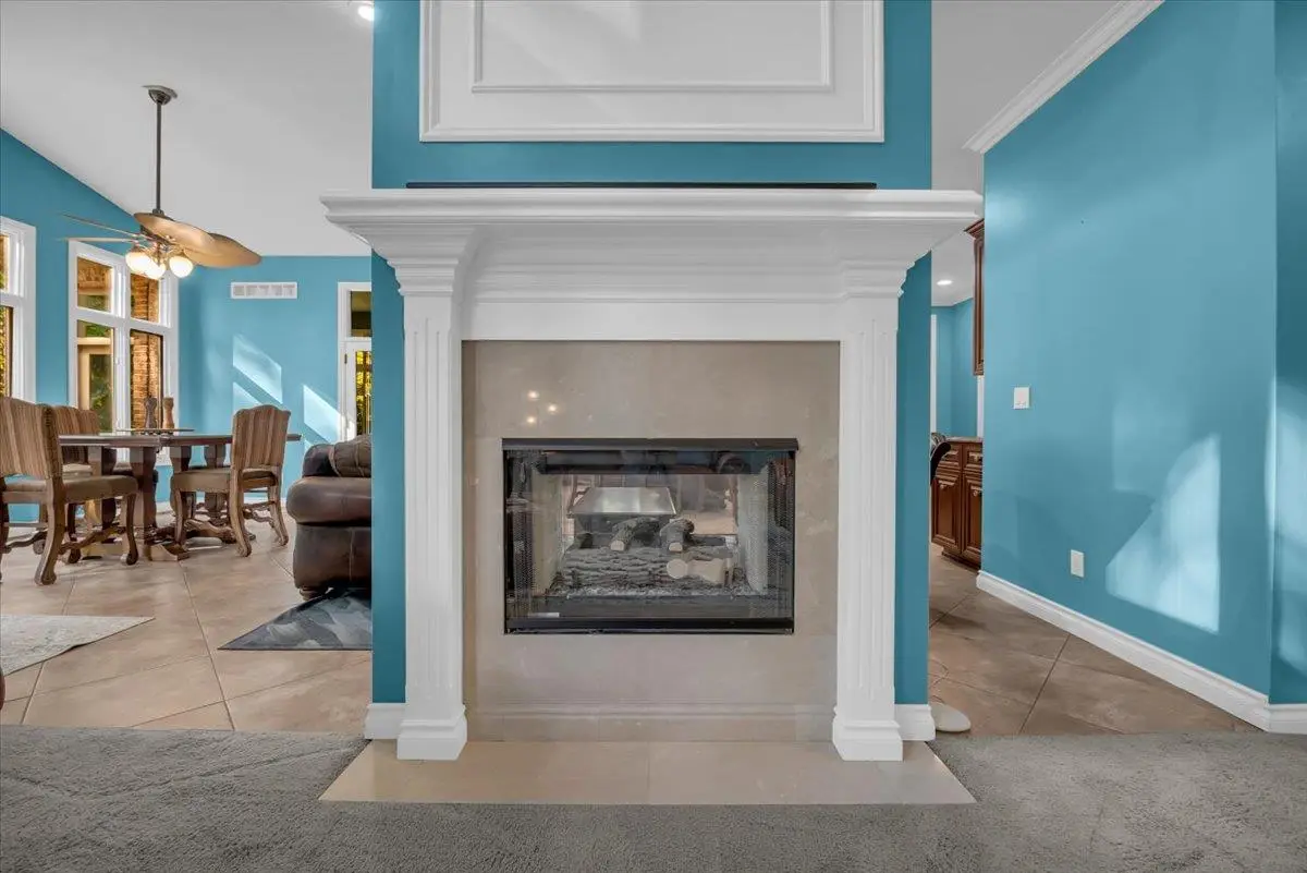 Stone fireplace shared with hearth room
