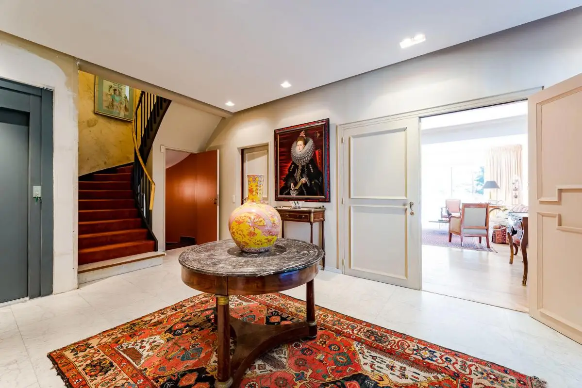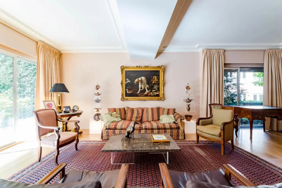 In the very exclusive Square du Bois, a beautiful house with character and a splendid south-facing garden designed by Jacques Wirtz, opening onto the Bois de la Cambre (plot of approximately 6 ares85). Living space of approximately 600 square meters currently divided into two units: a duplex garden level of 400 square meters and a duplex penthouse of 200 square meters enjoying a beautiful panoramic terrace. Service flat (two bedrooms, bathroom). Lift. Garage for two cars. PEB D.