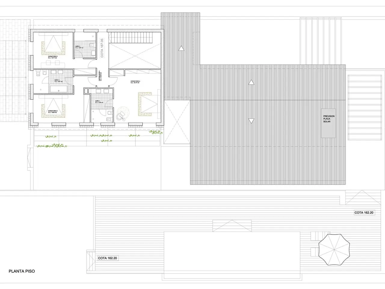 This exclusive project is currently being built on a large plot of land and offers a wonderful view of the surrounding landscape. During planning, the house was ideally integrated into the gently sloping terrain. The open living-dining area, with the terrace in front of it and the pool, forms the center of the house. The adjacent kitchen completes the area, especially with its breakfast terrace on the eastern side of the property. All bedrooms are in the two-story wing of the house. The entire ground floor houses the master bedroom with dressing room, en suite bathroom and a small studio. On the upper floor there are three bedrooms, each with its own bathroom. The basement offers a garage for up to three vehicles, as well as the possibility of setting up a bodega and a fitness room. There is also another room with a bathroom. The technical equipment includes underfloor heating and integrated air conditioning.