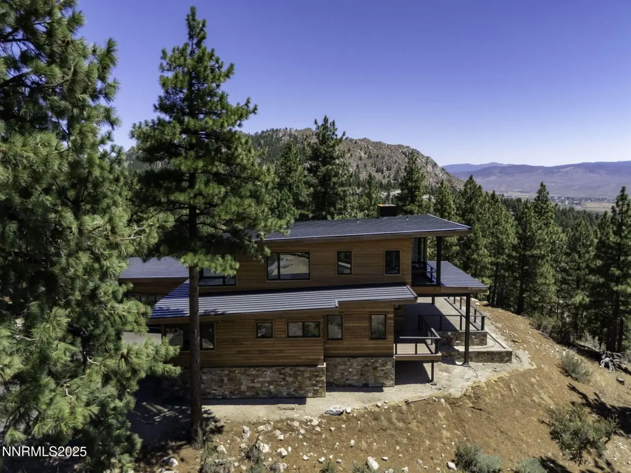 This exceptional property is truly one of a kind. Perched on a knoll high above Carson Valley, it offers breathtaking panoramic views in nearly every direction. Situated on one of Clear Creek Tahoe's premier view lots, the unique shape and topography of the land ensure unparalleled privacy. From the moment you drive along the winding driveway, a profound sense of serenity and seclusion envelops you. The main residence is gracefully positioned at the rear of the property, commanding a dramatic vantage point., The 3,587 square foot mountain contemporary home features an open floor plan and expansive walls of windows that frame the majestic scenery. Designed with feng shui principles in mind, the home showcases clean lines, spacious interiors, and abundant natural light to highlight the beauty of its surroundings. An oversized garage provides ample space for recreational vehicles, boats, or tandem parking. Additionally, the property includes a generous 1,800 square foot guest house, complete with a one-car garage, two bedrooms, a large living area, and a deck. Perfect for long-term guests, caretakers, or a tranquil workspace away from the main residence. At Clear Creek Tahoe, their vision is bringing together physical amenities creating a stage for a magnificent life experience. The nationally acclaimed golf course is fully mature and ranked number one residential course in Nevada. The Lake and Ski House allow members to enjoy 180' of sandy beach, water sports and shuttle service to Heavenly Ski Resort, and our newly completed Summit Camp offers swimming tennis, hot tub, water slide, bocce and more. Additional amenities include a spacious Clubhouse with workout/wellness facility open year-round.