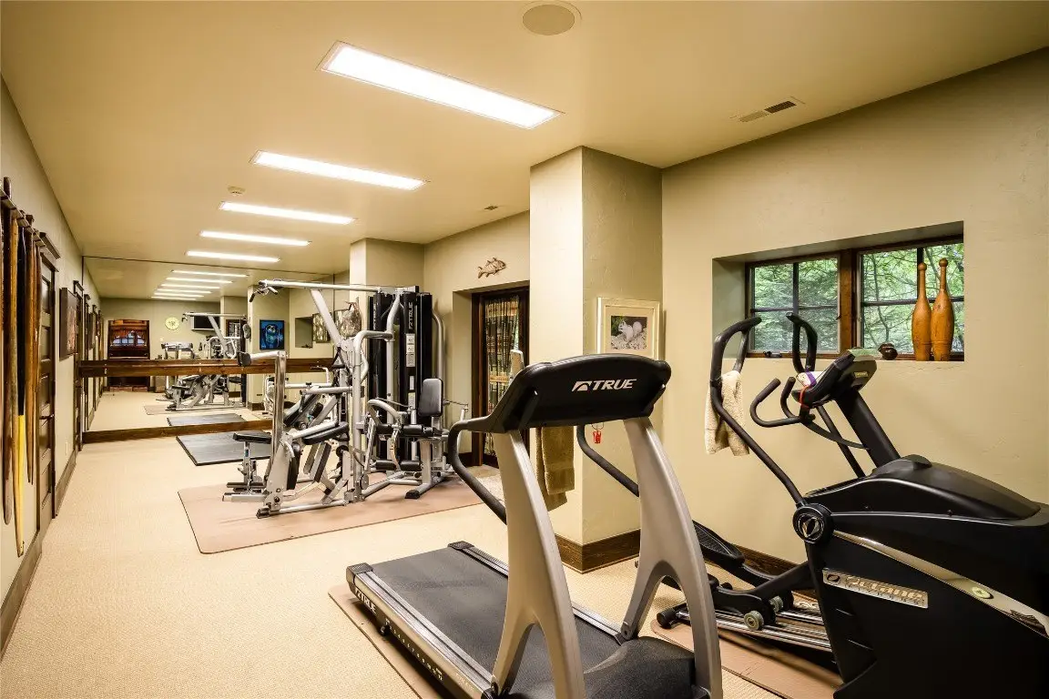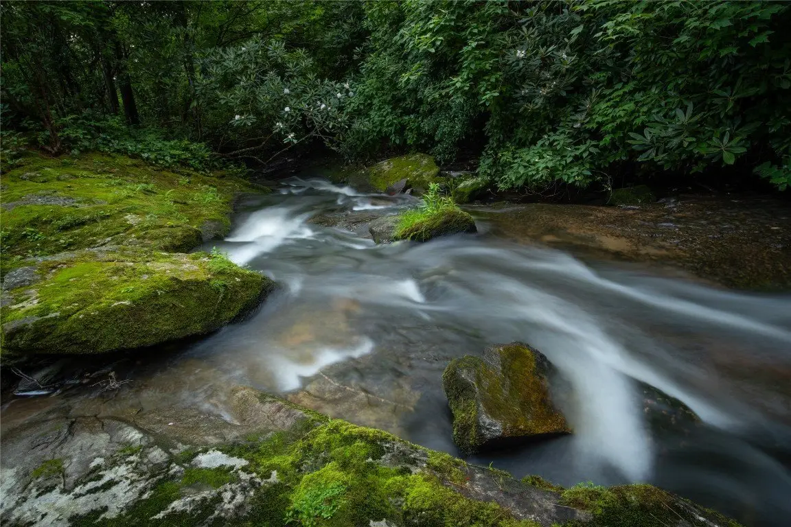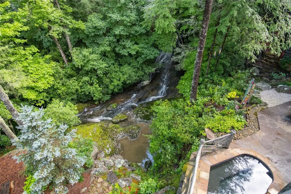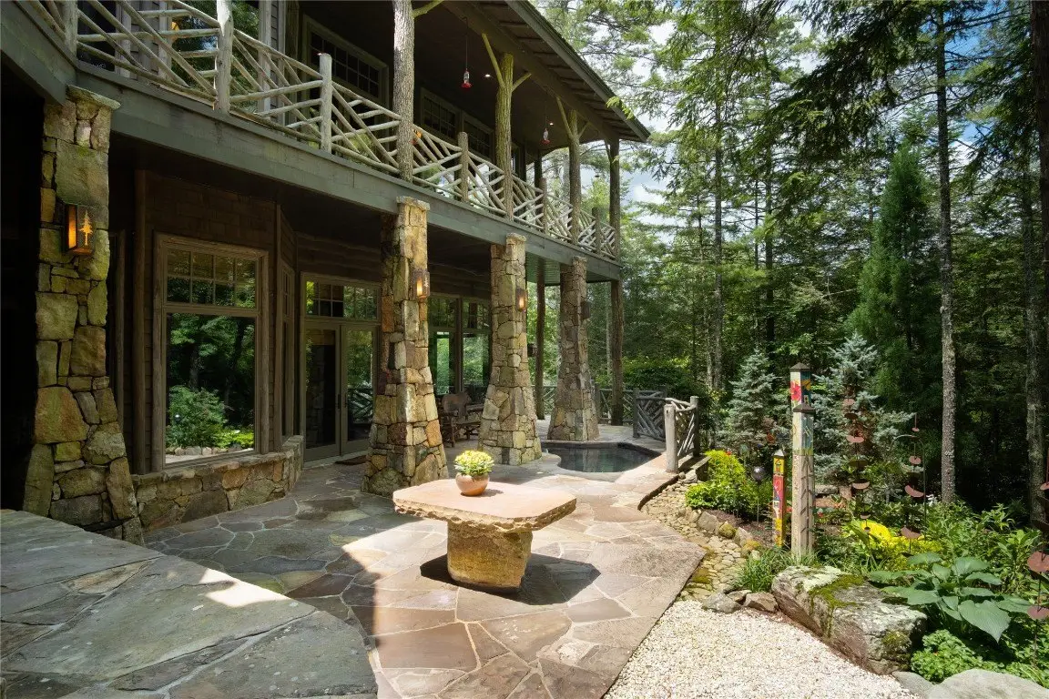 Just minutes from the shopping and fine dining of downtown Cashiers, Blue Bear Camp is the ultimate Adirondack-style mountain lodge. This prime property borders the Nantahala National Forest, ensuring privacy and abundant wildlife. Another world awaits in the dream-like setting amid the wild Chattooga River, flowering landscaping, a sparkling waterfall, and lush forest, all against the stunning backdrop of Whiteside Mountain and Devil's Courthouse. Reminiscent of the great camps in the early 1900s, the rustic decor is warm and welcoming with natural wood details such as pine logs with golden chinking, wax-rubbed reclaimed heart pine floors, and a grandiose circular log staircase surrounding a seven-foot antler chandelier. The staircase is a masterpiece of engineering, constructed from Colorado Ponderosa pine over three months. Much of the custom furniture and details were built by local craftsmen on site. Other unique finishes were created by artisans from across the country, using natural materials such as mica, aged copper, shed elk antlers from Wyoming, Canadian birch bark, wormy chestnut, and turquoise. The stunning stonework and multiple fireplaces throughout the home were built from Tennessee fieldstones, many of which reveal 300,000-year-old fossils. In addition to the private guest quarters with a kitchenette and laundry room, the sprawling three-story home with an elevator offers an abundance of space for family and guests to explore, including a sunroom, library, an artist studio, game room, wine cellar, a resplendent home theater, and a fitness room with a sauna and steam room. Nature lovers will revel in the magical surroundings and fresh mountain air on the covered porch amid sights and sounds of the rushing waterfall. There's something for everyone to enjoy in an area offering residents access to the countless natural resources and opportunities for outdoor recreation such as hiking, fly fishing, biking, skiing, and golf.