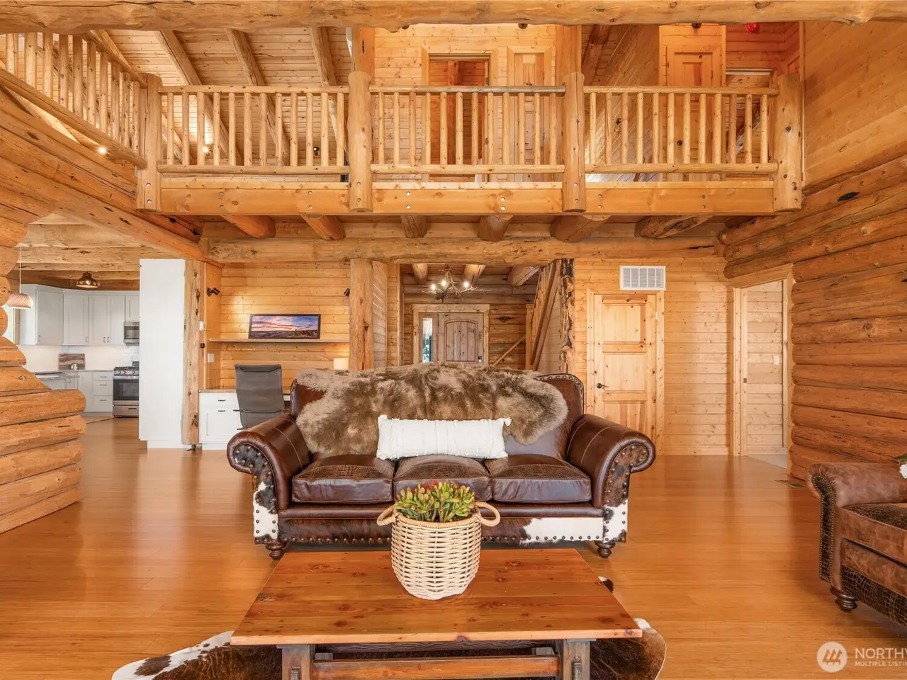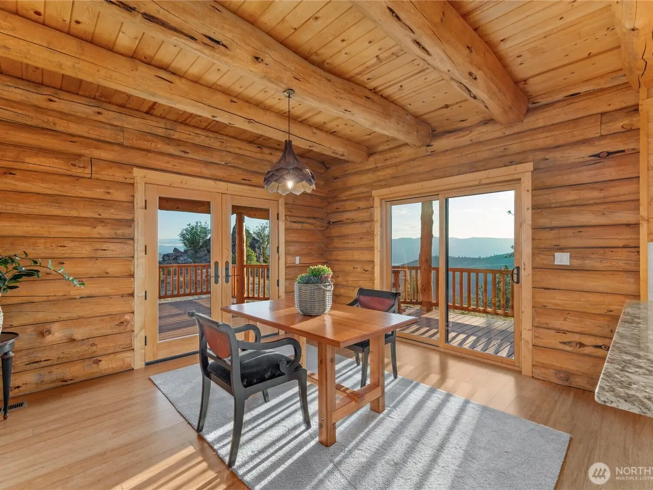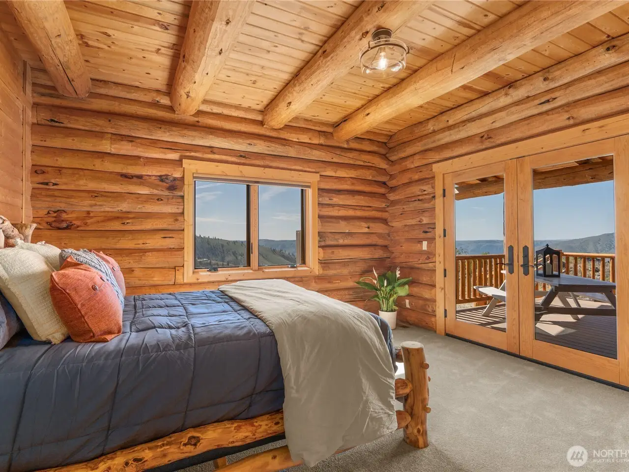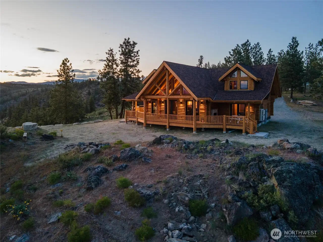 PRIVATE GATED MOUNTAIN ESTATE! New construction three bed, 2.5 bath 2,697 square foot custom-built luxury log home in Chelan Vista Heights with six lots totaling 124 acres with sweeping views overlooking Lake Chelan. The main floor features a great room with double sided fireplace and vaulted ceilings, bamboo flooring, light-filled kitchen with granite countertops, dining room, primary bedroom and French doors throughout leading to a classic covered wraparound porch. The upper level loft features a Bonus Room plus two additional bedrooms and bath. Secondary cabin with view porch. Detached two-car garage, Chelan PUD power throughout the entire property, two wells and two 1,900 gallon cisterns with water softener and filtration. The additional homesites offer development opportunity.
