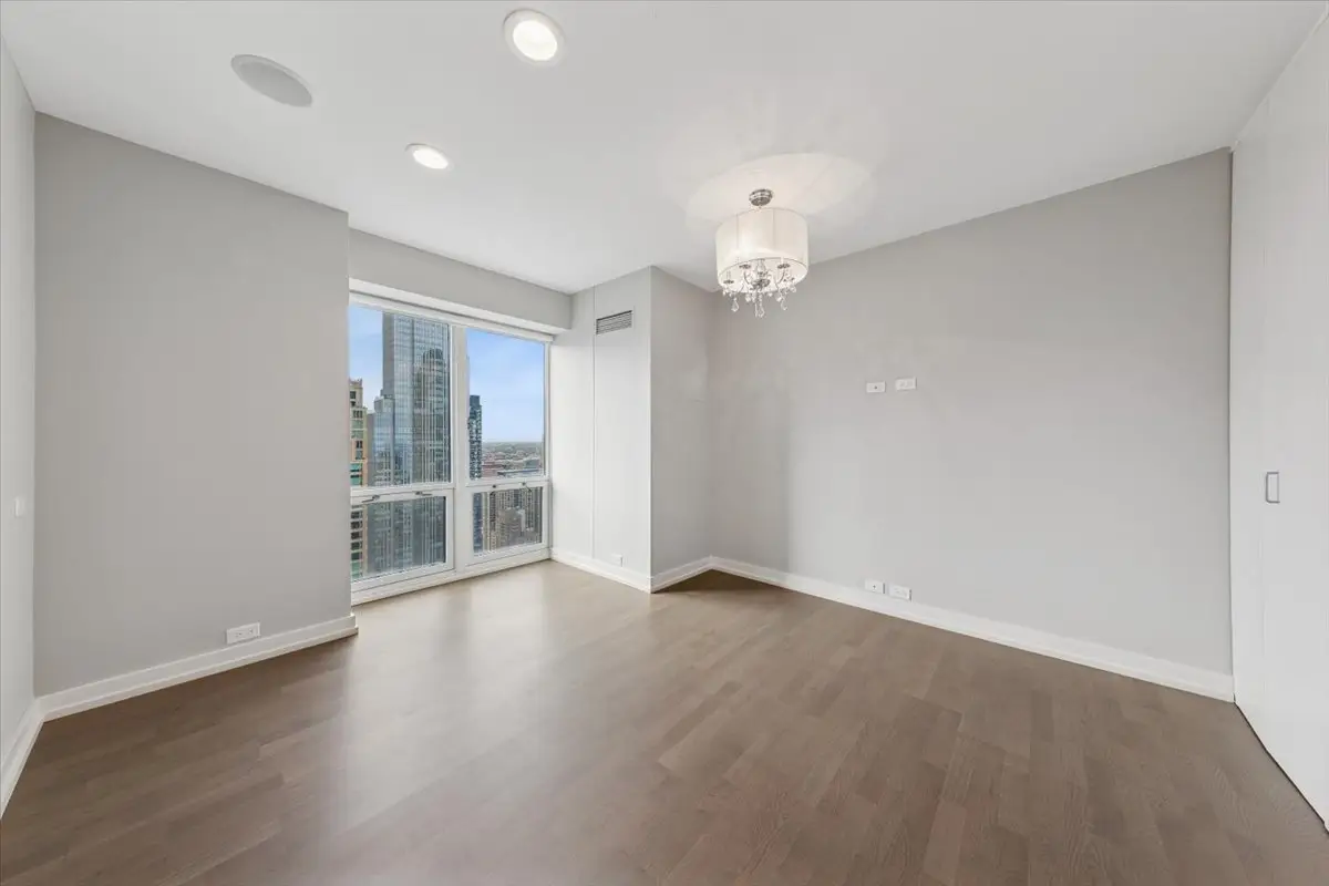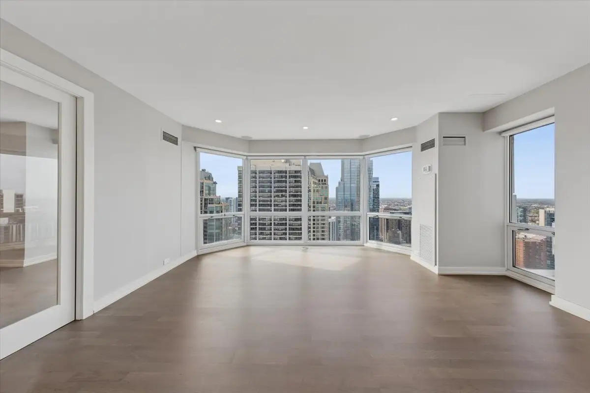 STUNNING RENOVATION has an open, harmonious layout with well-proportioned rooms designed for everyday living and entertaining! Spacious and sun-drenched on a high floor with sweeping west, north, and south views from every floor-to-ceiling window, this beautifully designed 3 bedroom, 2.5 bath residence (3rd BR currently used as Family Room/Office) exudes modern elegance and meticulous attention to detail. Wide plank flooring, custom glass pocket doors, designer lighting, and premium finishes create a seamless blend of sophistication and livability. The gourmet kitchen impresses with island seating, abundant custom cabinetry, high-end appliances, and a wine refrigerator - perfect for entertaining. Distinctive bath materials, integrated sound system, in-unit washer/dryer, and whole-home humidification add comfort and convenience. Heat and air conditioning included (electric for blower). Luxury building in an ideal location - steps from Michigan Avenue's Magnificent Mile shopping, dining, and transportation, this building offers superb service, fitness center, indoor pool, on-site dry cleaners, and valet or self parking for a fee. Don't miss this opportunity to enjoy this impeccable residence offering outstanding value in Chicago's most desirable neighborhoods! ***(NOTE: This floorplan (2100sf) is larger than the ""01"" tier units above the 39th floor).