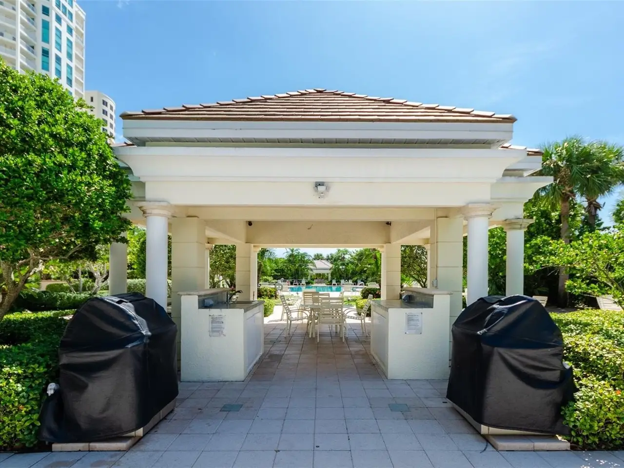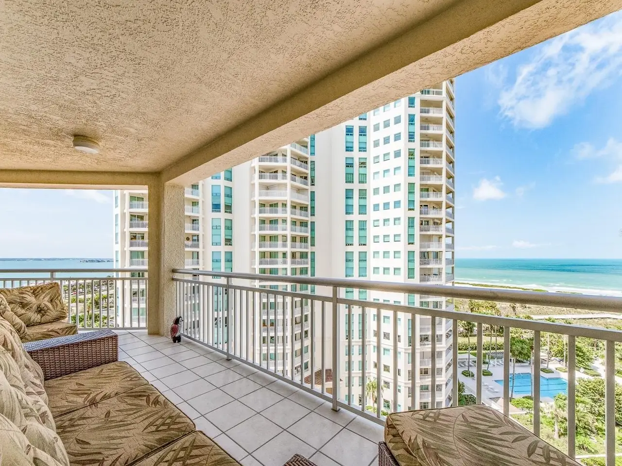 WELCOME to one of the most prestigious BEACHFRONT developments located in all of Tampa Bay / Clearwater / St. Pete, The GRANDE on SANDKEY. This beautiful, well maintained southeast corner residence has been recently updated featuring: neutral ceramic tile throughout, solid stone kitchen countertops, solid wood cabinetry, back flow unit installed in kitchen sink, hurricane storm shutters, murphy bed in bonus den room, new air conditioning unit, new water heater, new washer & dryer, and duct work cleaned and disinfected in 2024. Balcony views from the primary bedroom view North Eastward to the intracoastal waterways, Sand Key bridge, Memorial Causeway, and Clearwater / Belleair inland. The wraparound balcony (kitchen, living room, bonus room) views span across the intracoastal waterways, main inland, overlooking the pool grounds and out to the open Gulf of Mexico. The Grande's superb amenities include: two swimming pools, large outdoor spa, cabanas, outdoor pavilion for your grilling pleasure, fitness center, tennis courts, spacious social room for gatherings or events, billiard room, concierge services, and 24-hour security. In addition, the Sand Key Plaza (directly across the street) houses small boutiques, several restaurants, and Sand Key Realty. Take a tranquil stroll on Sand Key beach, or travel 1 mile North to visit North Americas #1 beach. As the day comes to a conclusion, you will witness the most serene and majestic sunsets while relaxing by the pool side or your wrapped around balcony. Paradise awaits you at The Grande on Sand Key...