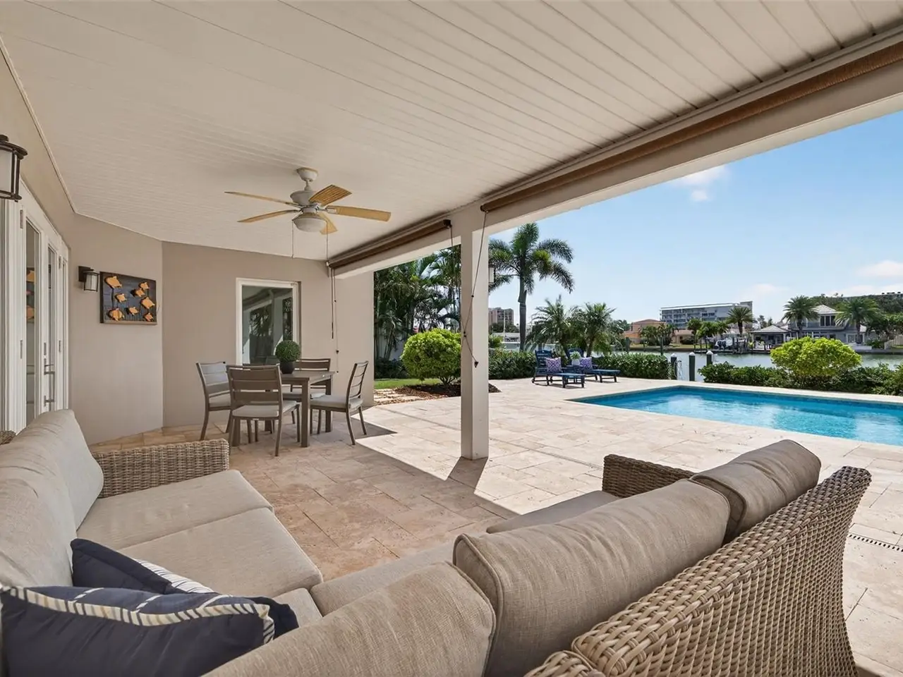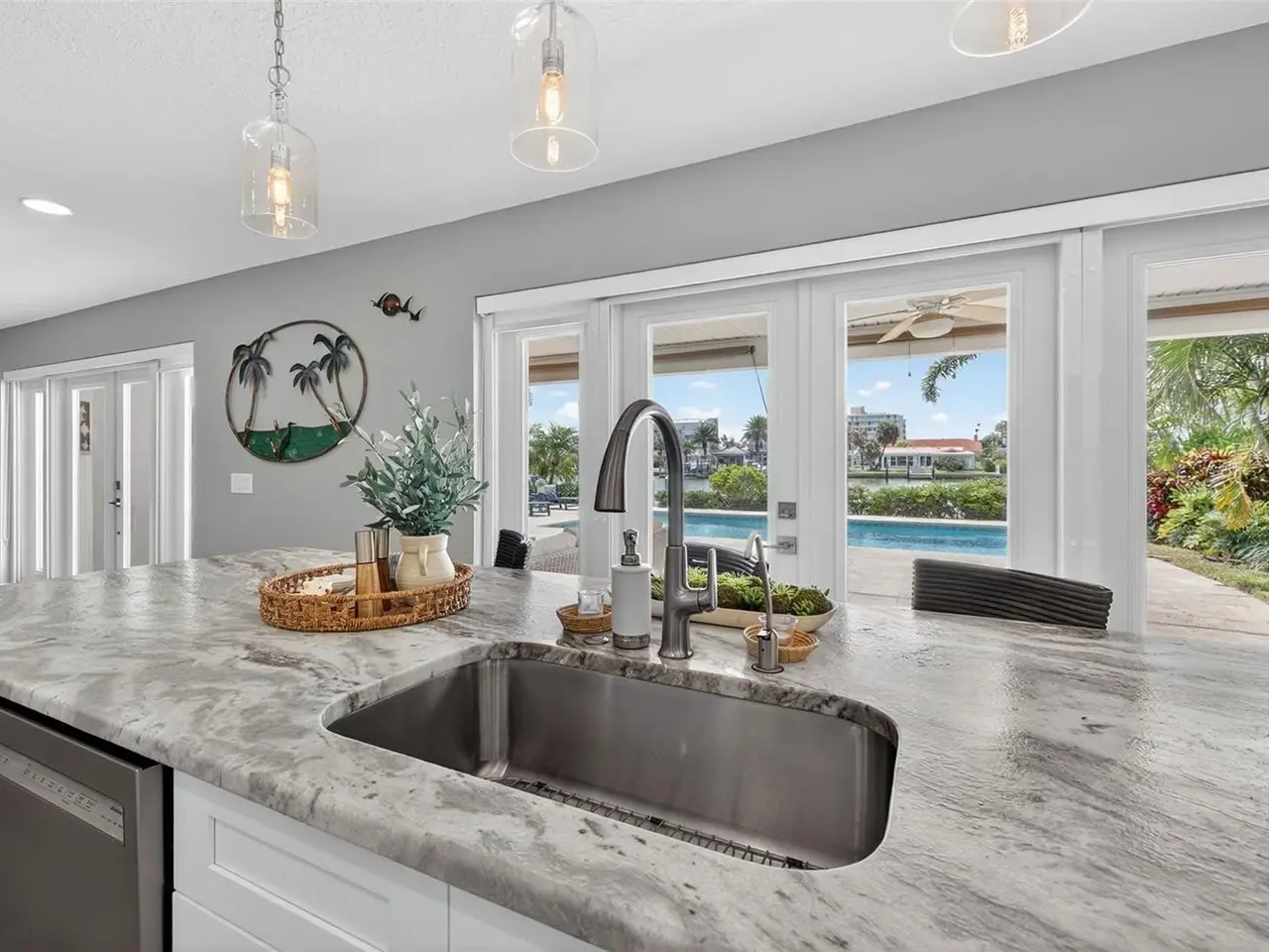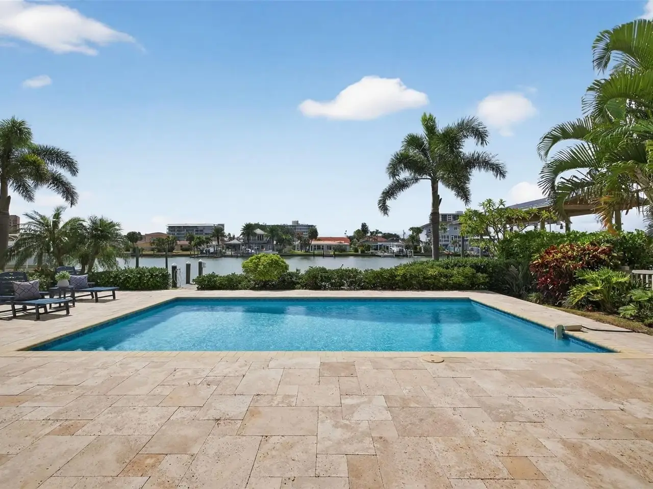 Under contract-accepting backup offers. Experience waterfront living at its finest in this beautifully remodeled Island Estates residence. With three bedrooms, two bathrooms, and refined finishes throughout an airy, open layout, the home is designed to make every day feel like a vacation. Step through the front door and take in sweeping water views and light-filled living spaces, perfect for effortless coastal living and easy entertaining. The kitchen is a true centerpiece, featuring a large leathered-granite island ideal for casual dining, a 4-burner gas cooktop, sleek stainless-steel appliances, abundant storage, and captivating views that make cooking a pleasure. A split-bedroom plan ensures privacy for the primary suite, complete with a beautifully tiled shower and a quartz dual-sink vanity, while comfortable guest rooms and a large indoor laundry room add everyday convenience. Open the back doors to a resort-style backyard with a saltwater in-ground pool, a covered patio, lush tropical landscaping, and seamless canal vistas. Your private dock includes 30-amp electrical service, ready for a future boat lift and ideal for launching kayaks and paddleboards, so you can spend more time on the water and less time in the car. Blending luxury, function, and the best of the Island Estates lifestyle, you are just minutes to Clearwater Beach, dining, and the open water, this waterfront retreat is tailor-made for buyers who want to live where they love to play.