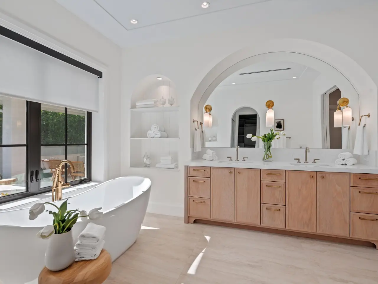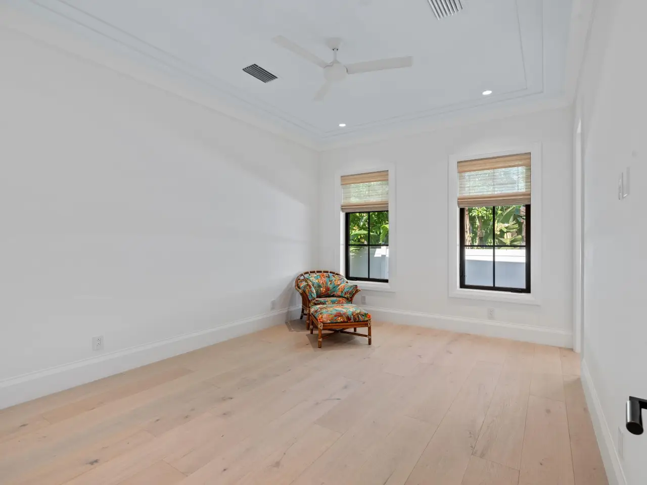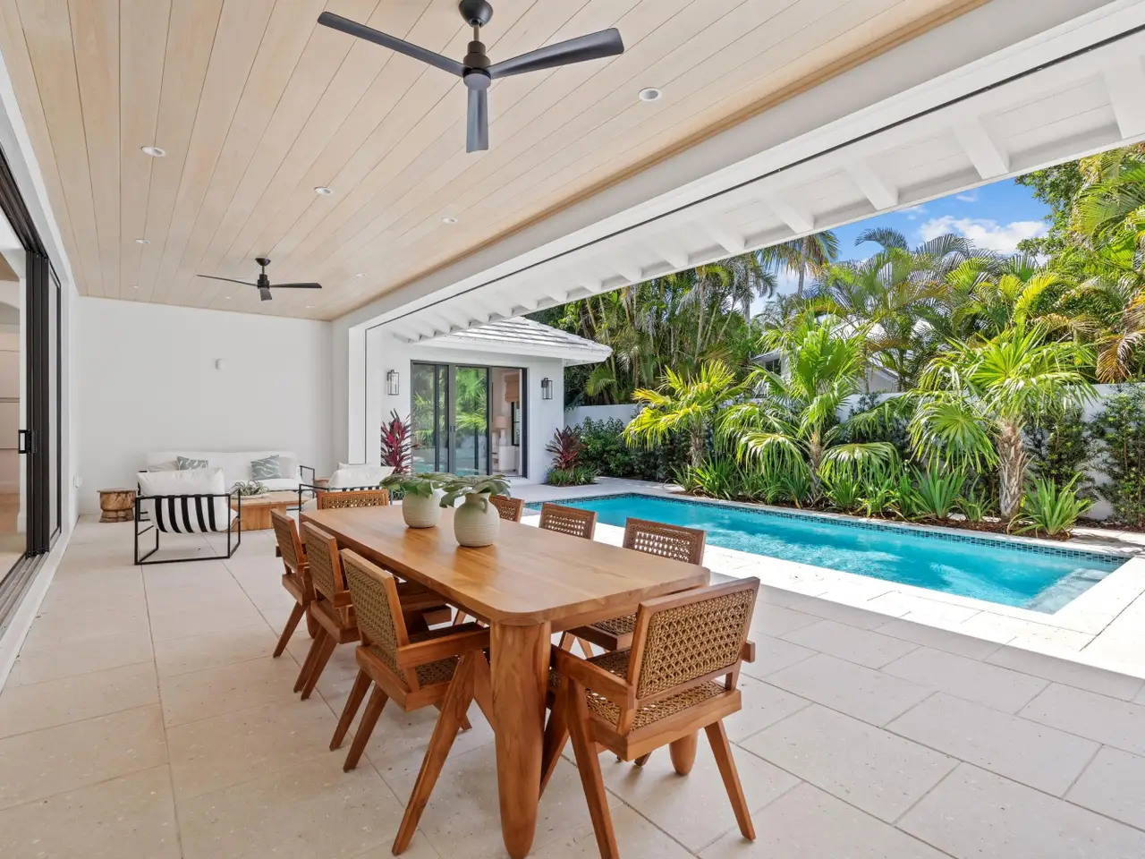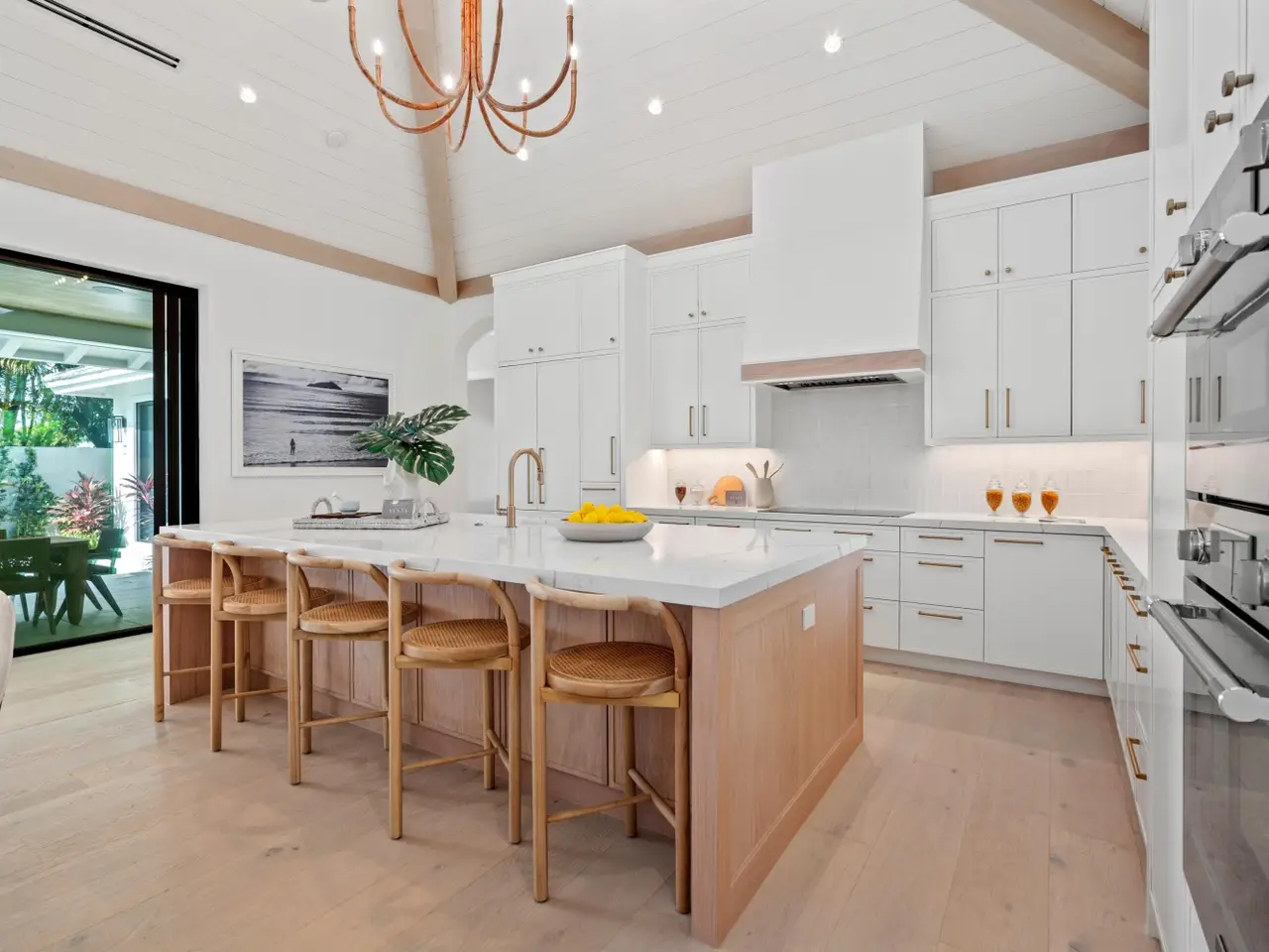 On a prime corner lot in Delray Beach's coveted Lake Ida enclave, this chic 2025-built contemporary residence offers an open floorplan great room, topped by a beamed vaulted ceiling, accessing the pool loggia and summer kitchen; four bedrooms with the primary bedroom opening to a private covered patio, a pocket office; and a cook-island kitchen with two-tone cabinetry, quartz counters and Thermador appliances.