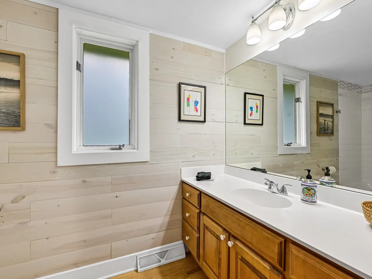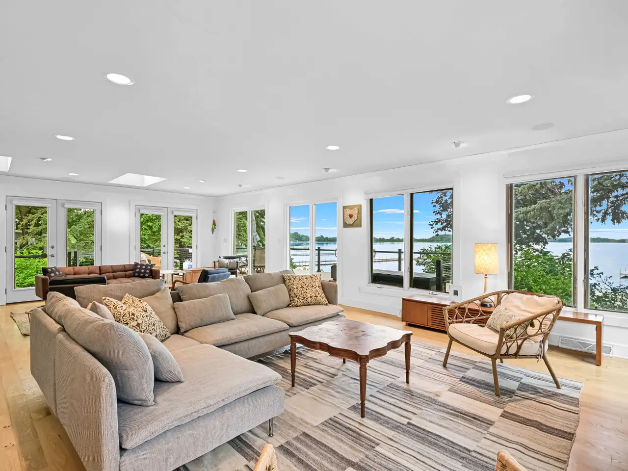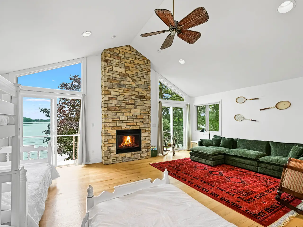 Imagine beginning your day with the breathtaking views of Eagle Lake, presenting a remarkable lakeside living experience. You can enjoy the final days of summer on your 87-foot flat lot, which offers stunning water views from a spacious, modern deck and a newly constructed pier with an expanded platform. Inside, you will find an inviting layout with a kitchen that features a large island, granite countertops, a tiled backsplash, stainless steel appliances, and attractive hardwood flooring. Enjoy the abundance of natural light from the numerous windows and new patio doors that showcase the beautiful lake perspectives from every angle. Two primary bedroom suites, situated on different levels, provide a wonderful sense of privacy for residents. The upstairs suite boasts a private balcony, a gas fireplace, and vaulted ceilings that enhance your appreciation of the peaceful lake views.
