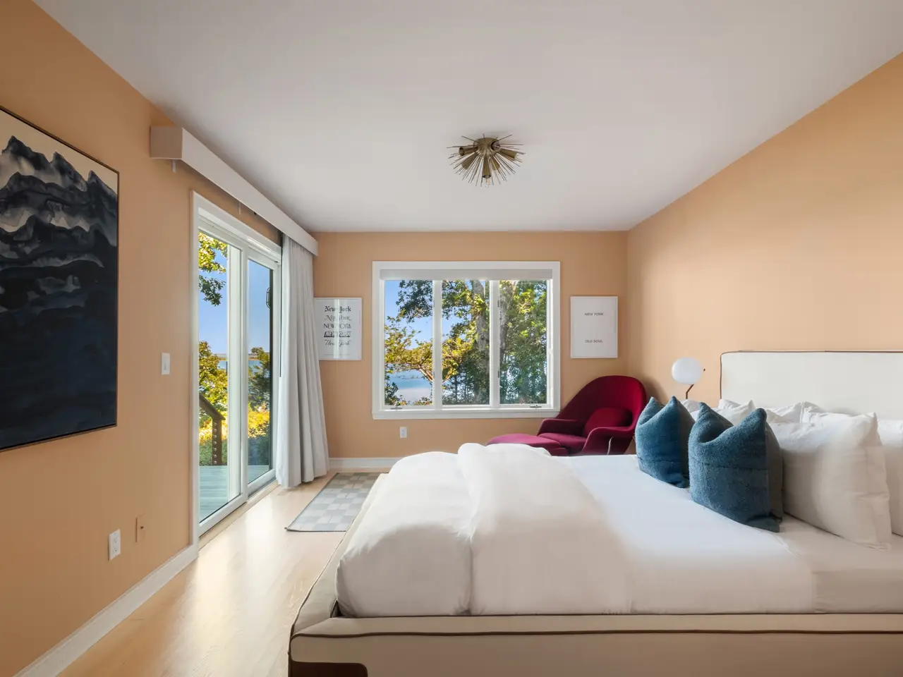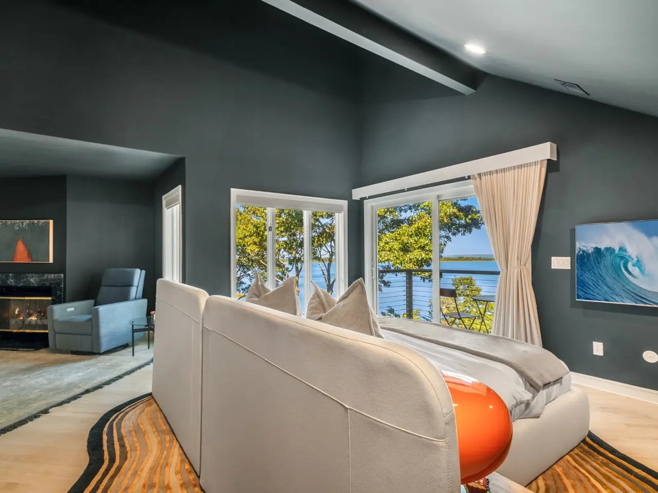 RR# 22-1583. Enjoy sensational views over Three Mile Harbor and beyond from this dramatic waterfront home set high atop a freshly landscaped shy acre. The residence is set back on the property to offer both privacy and an exceptional vantage point for its 180-degree vistas. Recently renovated and professionally designed, the 4,100 square foot interior features an open concept living and dining room with a soaring double-height wall of windows that create a dramatic theatre for the surrounding natural beauty. Sliders lead to a 1,000-plus square foot furnished deck that extends the dining, lounging and entertainment space to the outdoors. A Sonos indoor/outdoor music system enhances the seamless environment. Three spacious bedrooms and two full bathrooms complete the first level. An expansive ensuite primary bedroom on the second level features a sitting area with fireplace, a private balcony and floor to ceiling windows that offer some of the best views in the house. The finished lower level includes a media room with a new pullout sofa and its own full bathroom. French doors offer separation and privacy from the tiled gallery that opens to the outside property. A lush lawn with loungers and an additional dining area surrounds a heated pool with a stylish bluestone coping. A pebble-stoned path leads to a private beach below with a firepit and Adirondack chairs as well as a convenient rack of available paddleboards and kayaks. This magnificent rental property is located on the notorious Three Mile Harbor Drive of Settlers Landing and is only moments away from Sammys beach and all the famous waterside restaurants along the opposite side of the harbor.