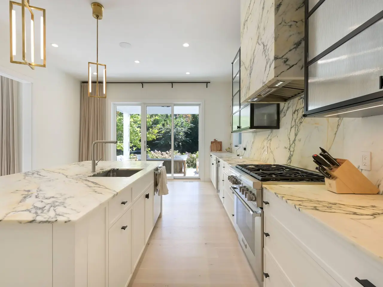 Beautiful architectural design, exquisite details and a coveted location in the Settlers Landing community of East Hampton combine to create an exceptional new offering. Built in 2019, the sophisticated design spans approximately 5,093 square feet of elegant living space on three levels, with floor plans that flows seamlessly throughout. The living room features a fireplace with custom, carved wood mantle and walls of cascading glass doors opening to an extensive bluestone patio. The kitchen is truly a showstopper, with a full wall of gorgeous marble, marble counters, custom iron and frosted glass cabinetry and an informal dining area with large sliding glass doors leading to the terrace. A light-filled formal dining room provides ample space for entertaining. Meticulously appointed throughout by a renowned decorator who captured the home's openness and light through the brilliant use of color, materials, and decor. The four bedrooms and four and one-half baths include an impressive master suite with private terrace and luxurious bath. The finished lower level is outfitted with a full bar, gaming and entertaining areas, a gym and a professional quality home theater with sumptuous seating. The 0.60-acre grounds, exactingly conceived by Landscape Details, are replete with extensive manicured plantings designed for all seasons, multiple outdoor dining and entertaining areas with imported designer seating suited for entertaining on any scale. Further highlights include a full outdoor kitchen with a Lynx grill, Kalamazoo pizza oven, refrigerator and icemaker, a firepit, and patios centered around the sparkling, heated gunite pool. This special property is located within the waterfront community of Settlers Landing, with deeded access to Three Mile Harbor nearby, and bay beaches moments away.