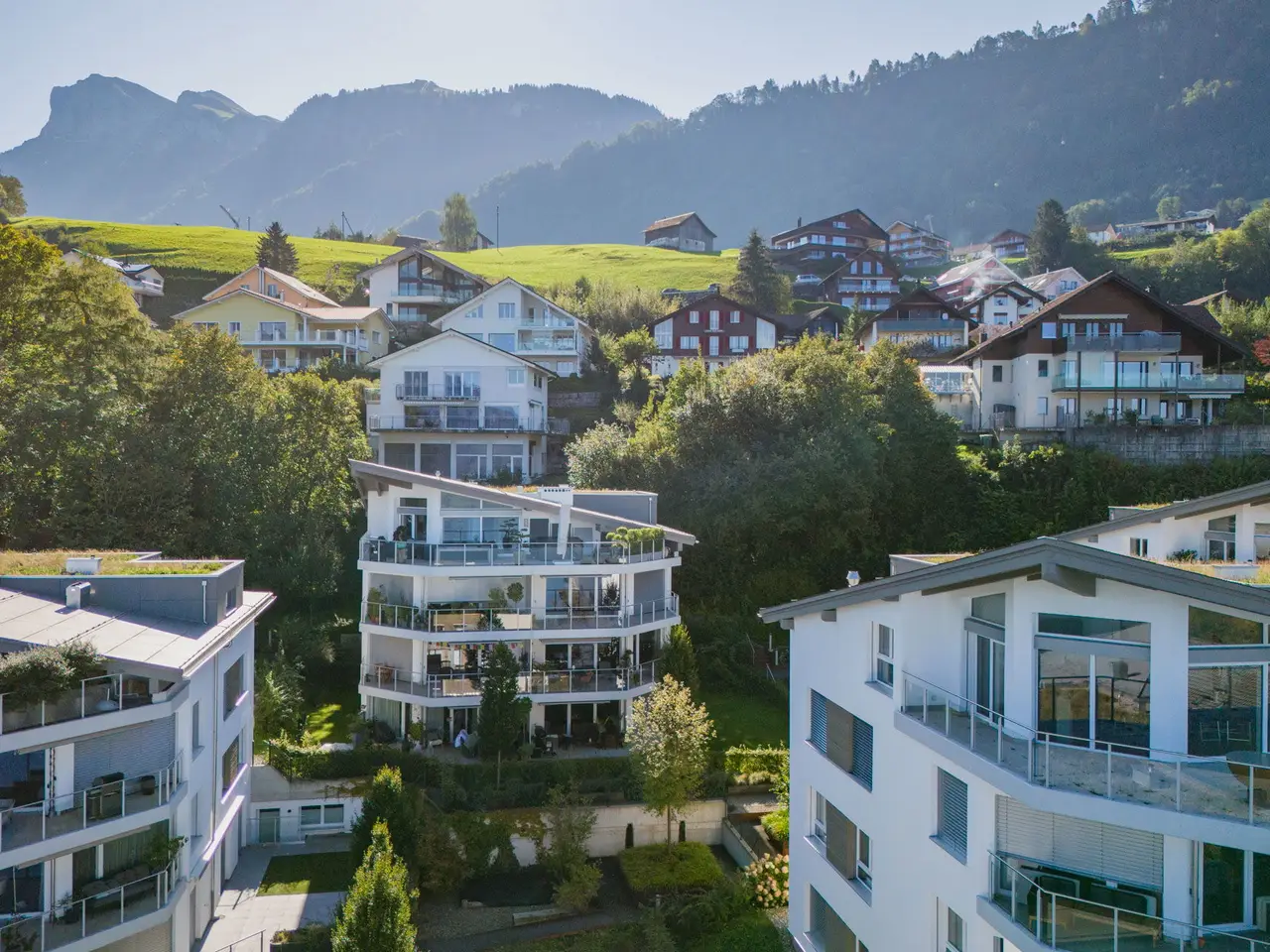 This 3.5-room flat is ideal for couples or small families. The open-plan eat-in kitchen blends harmoniously into the living and dining area and forms the central meeting point of the flat. The spacious bedrooms offer plenty of room and ample storage space for individual comfort. A highlight is the direct access to the spacious, covered terrace or garden, which extends the living area outside and creates a relaxing retreat with a magnificent view of the surrounding mountains. Spacious garden area Quiet and favoured residential area Idyllic and yet close to the city Modern flats with high-quality fittings Indoor car parking spaces are available for CHF 40,000 per space