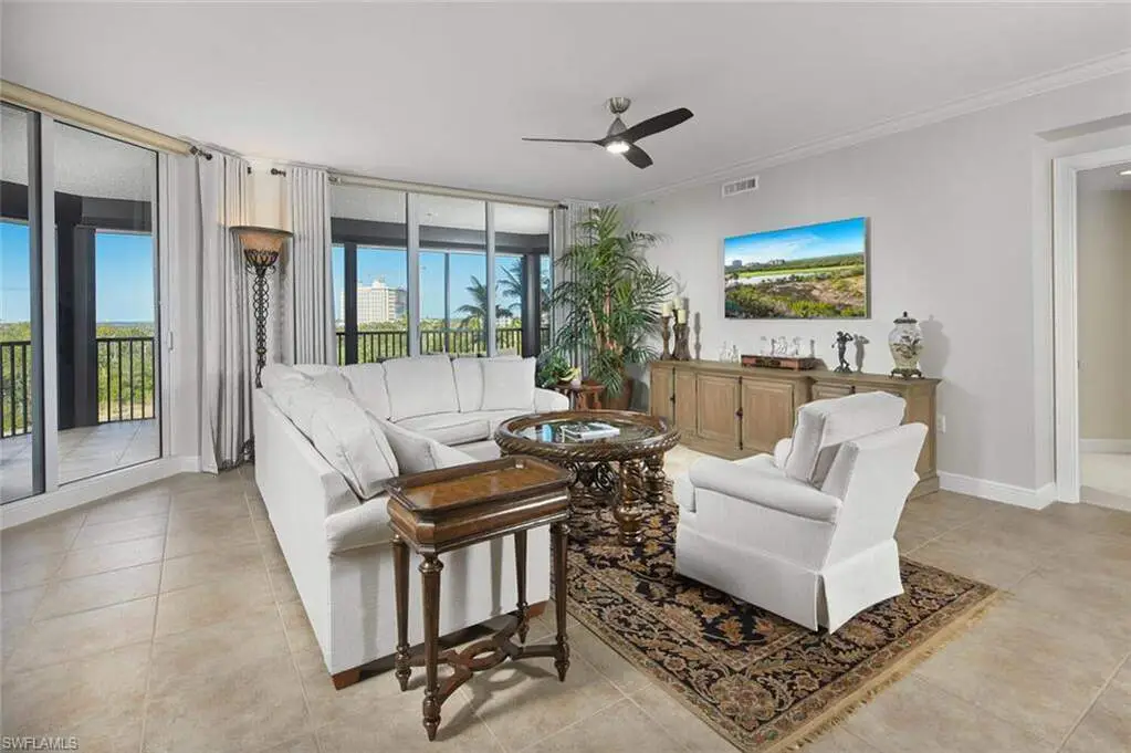Full Colony Golf Membership available to purchase with this exquisite luxury corner residence on the 4th floor of Florencia, showcasing breathtaking panoramic views that capture the stunning sunrises and sunsets over the Gulf of Mexico, Estero Bay, and the Colony Golf Course. Spanning an impressive 2,600+ square feet, this residence is designed for both comfort and sophistication, featuring a private elevator that opens directly into your home. With three spacious bedrooms, a den, two private terraces, and a large screened lanai complete with electric shutters, this home offers an unparalleled living experience. The open layout seamlessly connects the large kitchen and great room, providing impressive opportunities for entertaining guests in style. The kitchen has a SubZero refrigerator and other updated appliances that enhance both functionality and aesthetic appeal. This residence is not just a home; it's a lifestyle that embodies the elegance and opulence that discerning buyers seek. Florencia has a striking main lobby, social room, theater, fitness facility and pool. Two guest suites. Privacy officer to greet you and your guests and live-in management. Two parking spaces in the garage. Colony residents automatically enjoy a host of amenities including The Bay Club on Estero Bay with both casual and elegant private dining with gorgeous water views, a 34-acre private island beach park, 12 tennis courts as well as a host of other court sports including pickle ball and bocce; sailing, canoe and kayaking, as well. Located 1.5 miles west of the Coconut Mall, excellent dining and a swift trip to the airport.