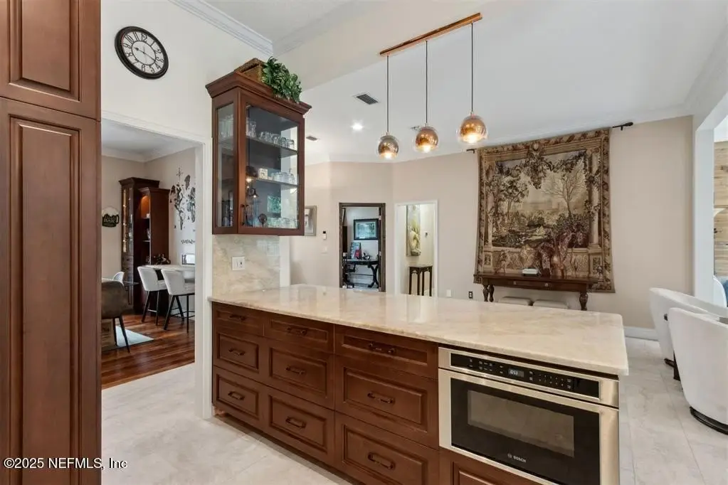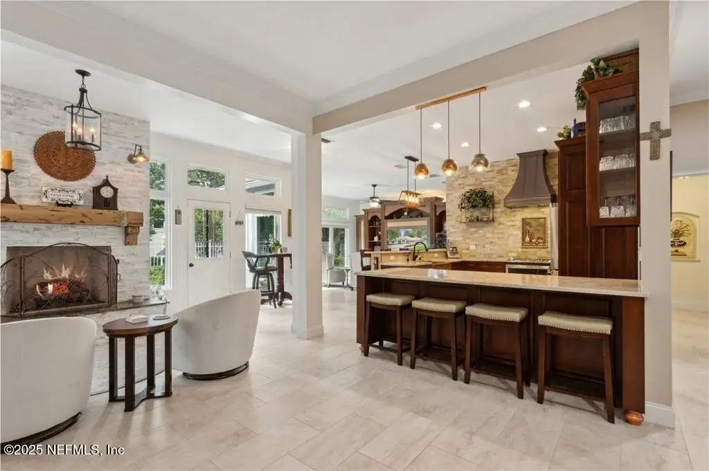 Where coastal elegance meets island living-this beautifully remodeled four bedroom three bathroom home in Golfside South offers 2,500+ square feet just steps from the beach, golf, and ocean breezes. Renovated 2019-2025 with new roof, impact windows, 300+ square foot addition, appliances, HVAC, water heater, travertine patio & more. Inside, enjoy a limestone fireplace, crown molding, and a designer kitchen with Taj Mahal quartzite, Bosch drawer microwave, hidden pantry & smart oven with air fryer. Spacious bedrooms and updated baths include a primary suite with sitting area, dual walk-ins, and a spa-like bath with copper sinks, jetted tub & marble shower. A custom pub room with built-in bar and wine/beer fridge adds unique charm. Relax in the oversized family room or on the private travertine patio under the oaks. This gated golf course community offers a private oceanfront pool and easy access to the Ritz-Carlton, shopping, dining & pristine shoreline. Move-in ready! Your island life awaits