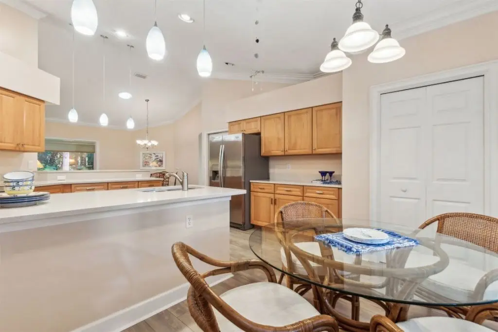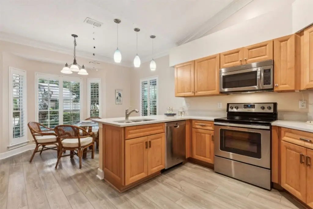 POPULAR & UNIQUE OCEAN VILLAGE....GATED Amelia Island OCEANSIDE COMMUNITY - EVERY HOME IS WALKABLE TO THE OCEAN....Single story home WITH LONG LIST OF OWNER UPDATES....AMELIA ISLAND'S MOST SUBSTANTIAL HOA AMENITIES: 2 swimming pools - one oceanfront - one heated, 3 CONVENIENT EASY ACCESS BEACH WALKWAYS, Tennis & pickleball courts, ENHANCED YARD CARE including irrigation...HOME IMPROVEMENTS INCLUDE: New ROOF and solar skylighting (2018), wood grain luxury vinyl plank flooring, carpeting, PAVERS for driveway, walkway & wraparound patio, sliding doors, Florida Room windows, exterior painting...KITCHEN REMODELING included: CABINETRY, Silestone countertops, stainless appliances, lighting, plantation shutters in breakfast nook...OWNERS BATHROOM REMODEL(2022) included: LARGE DUAL ENTRANCE WALK-IN SHOWER with bench seating, dual vanities with granite counters, cabinets, tile flooring....22x11 VERSATILE ENCLOSED FLORIDA ROOM with WOODED BACKYARD VIEW....South Amelia Island location near Ritz Carlton, bike/walk pathways, golf, restaurants and Harris Teeter grocery/pharmacy/gas.