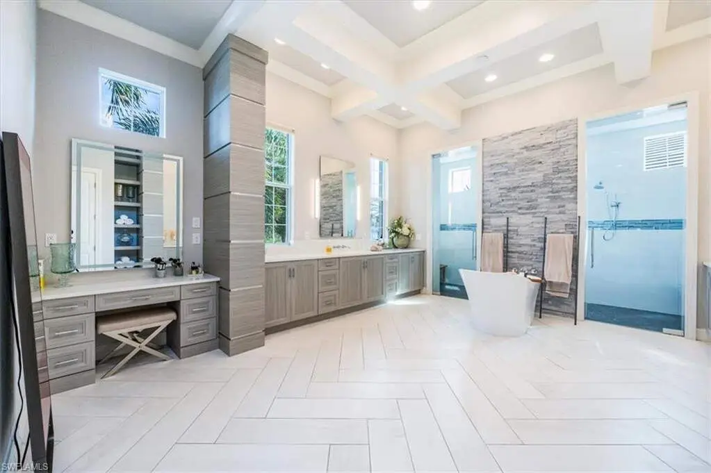 Tranquil primary bath with dual vanities Culinary kitchen with natural gas