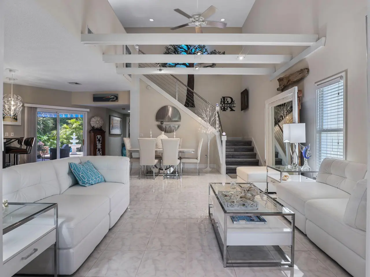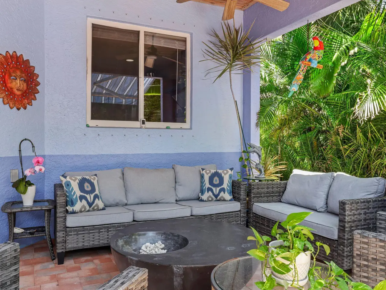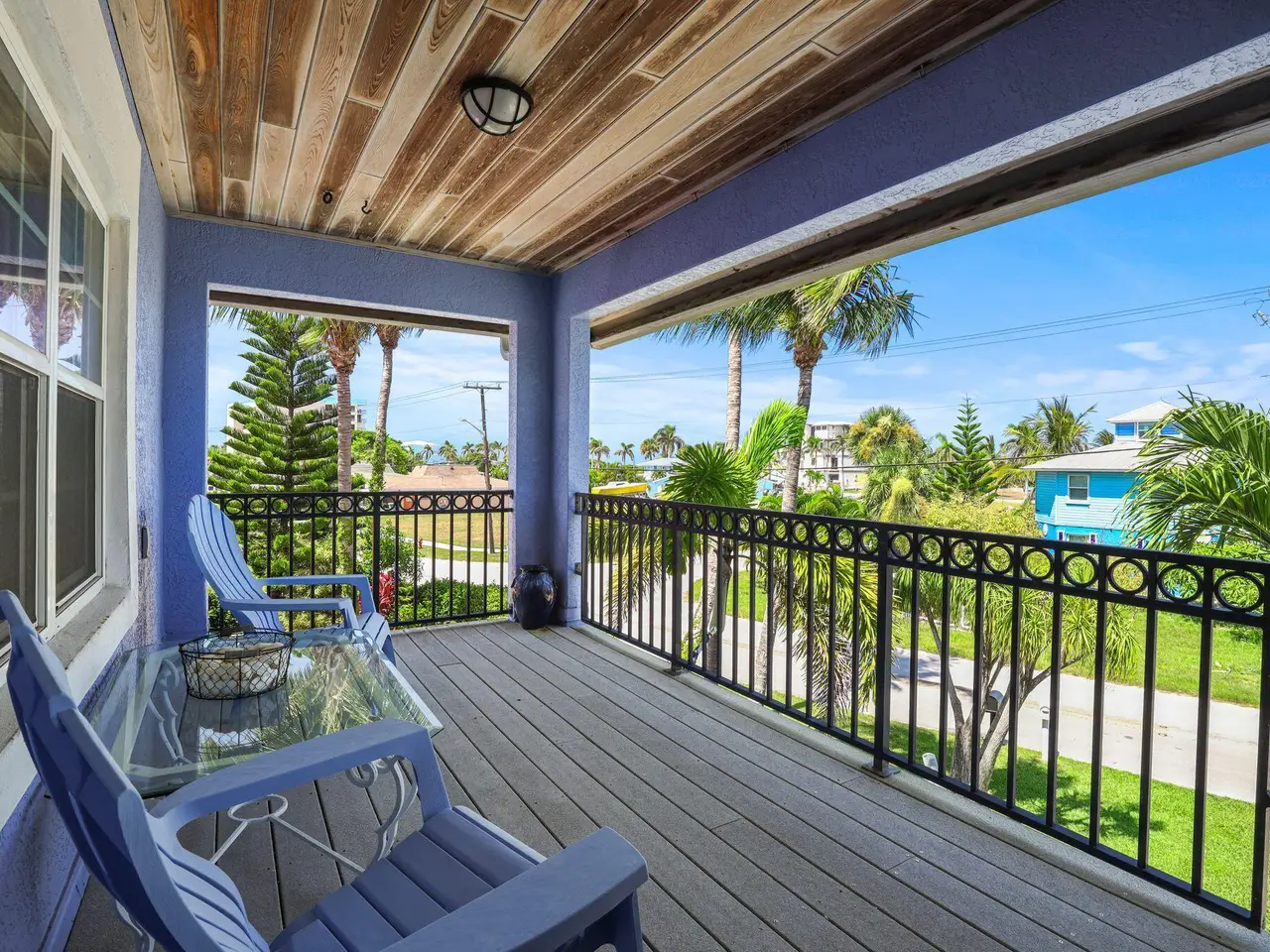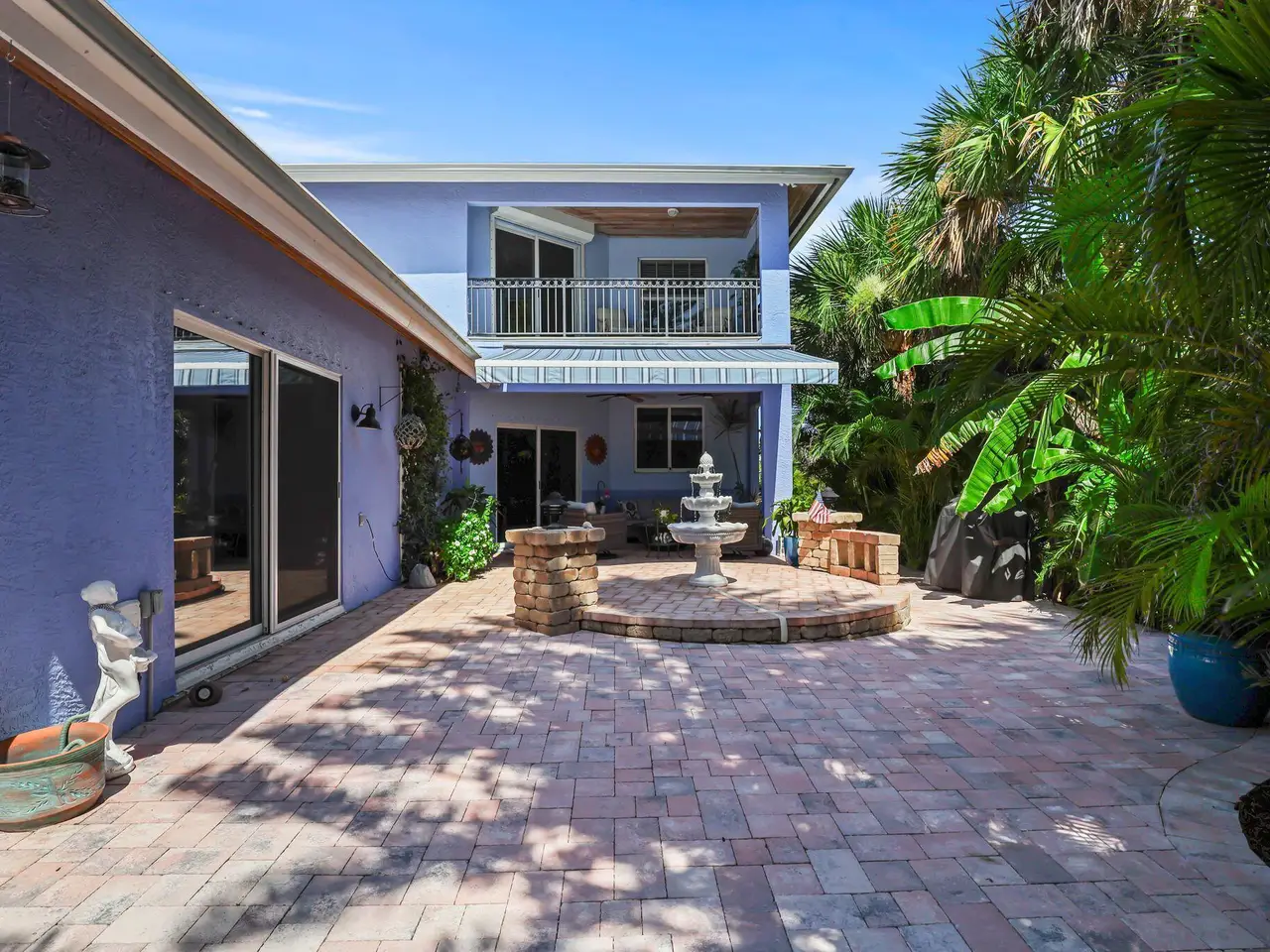 Great PRICE IMPROVEMENT. Best location just steps from the beach, restaurants, bars and the famous Fort Pierce Inlet. Unique Key West style home with 3 covered balconies, island views and custom smart features. Enter into a separate living area which opens into a large great room with soaring 20 ft ceilings. Two primary bedrooms, one downstairs with its own private en suite and a walk out to the tropical garden; one upstairs with its own separate living area, a private balcony that faces the ocean, huge walk-in closet and private en suite. Also upstairs, a guest bedroom w/ separate bath, and another large balcony that views the tropical backyard. Entertain friends in the open great room, kitchen and dining area. A chefs kitchen with oversized butlers pantry. All a block from the ocean!