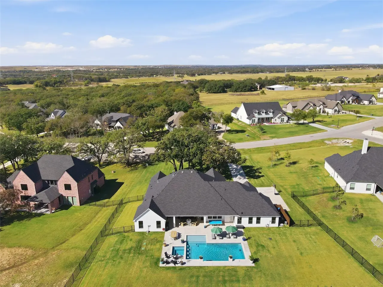 Experience luxury living on over an acre in Aledo ISD with this beautifully appointed home designed for comfort, style, and spacious indoor-outdoor living. A sweeping covered patio overlooks the resort-style pool and lush fenced yard, offering an ideal backdrop for entertaining or unwinding. The light-filled interior embraces an open layout anchored by a grand living room with a fireplace framed by custom built-ins. The elegant dining room showcases coffered ceilings, while the chef-inspired kitchen features quartz countertops, stainless appliances, gas cooktop, double ovens, butlers pantry, and a walk-in pantry. The breakfast room, with its charming built-in buffet and expansive backyard views, is the perfect everyday gathering space. A refined home office with French doors and full wall of built-ins provides the ideal work-from-home setting. The serene primary suite includes vaulted ceilings, a generous sitting area, and a spa-style bath with double vanities, soaking tub, separate shower, and a walk-in closet that conveniently connects to the oversized laundry room. Additional highlights include a second living room with a custom wet bar, a large storage closet, and a flexible bonus room that functions beautifully as a second office, nursery, or home gym.