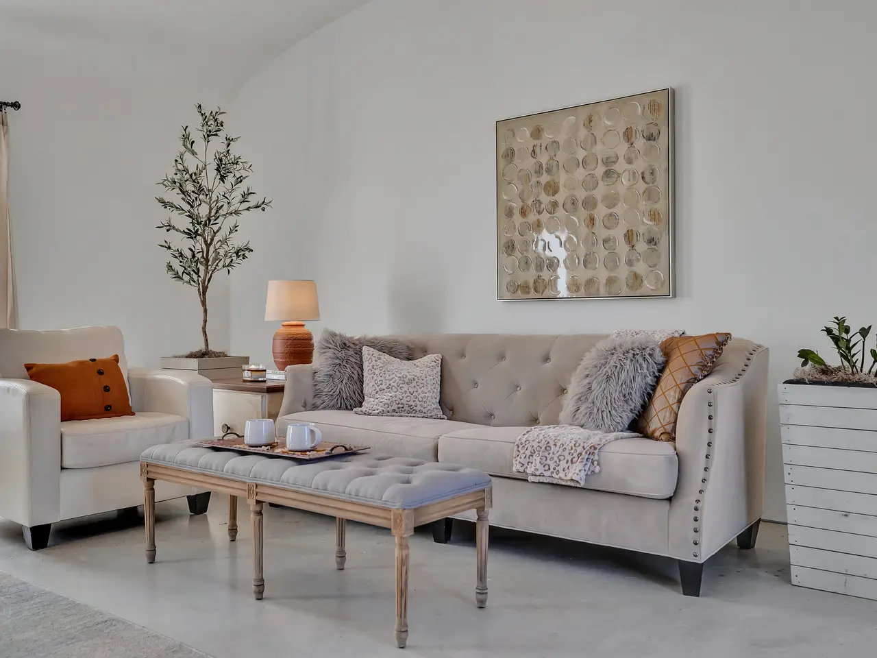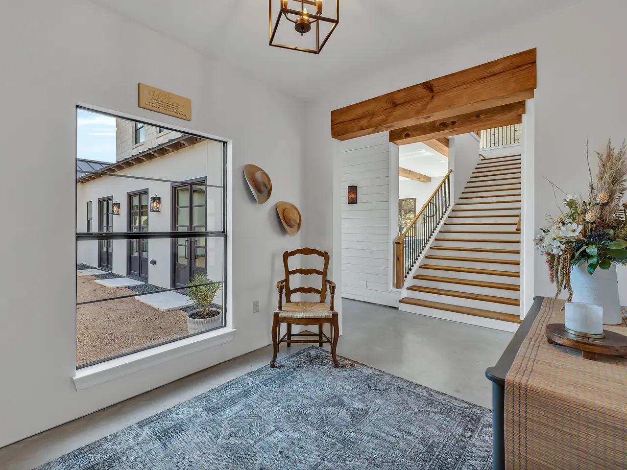 Experience serene luxury in a modern farmhouse nestled in the picturesque Texas Hill Country. The property is ideally located near the charming towns of Fredericksburg, Comfort, and Kerrville. Upon entering the property, an expansive limestone pathway leads to the entrance. The inviting courtyard adorned with a vine-covered pergola and twinkling lights provides a delightful spot to relax. The two-story home has been thoughtfully designed to blend functionality and luxury seamlessly. The first level features elegant hallways that guide you through the various rooms. The entire first level has heated flooring and recessed lighting with evening mood settings. The chef-ready kitchen is an excellent space for culinary enthusiasts, with multiple workstations, three sinks, high-end appliances, a butler's pantry, and quartz and woodblock countertops. The kitchen is perfectly set up for hosting events with separate stations for kitchen tasks, ample storage, and an 11-foot-long island that can accommodate up to five guests. The open floor plan leads to the dining area and living space, where large, rugged beams span the ceiling. The brick accent wall and wood-burning fireplace ground the light-filled room. Large solid steel entry doors line the exterior on each side of the home, providing easy access to the surrounding yard. The entire home is filled with natural light, and during the late afternoon, the main living area is transformed into a warm and serene space as the setting sun beams bounce off the floors, illuminating the space. The east wing of the home leads to the primary suite and office space. The elliptical arched ceilings with evening mood lighting provide an exceptional peaceful retreat. The en suite bath features a dual vanity, a freestanding porcelain tub, and a walk-in shower with a heated stone bench. The primary suite's dressing room boasts built-in shelving, a center console with storage, and a tri-fold mirror. The spacious and secluded office offers privacy and a reflective workspace. The second level features three spacious bedrooms, two full bathrooms, and a family room. The wood floors on the second level complement the abundance of natural light that fills the entire home. The property's detached oversized garage provides ample space for two cars, a golf cart/ATV, and extra storage. The barn, measuring 36x30 feet, is currently set up as a horse barn but can be restructured as a storage barn, among other options. Restful country living can be experienced at this tranquil, private home.