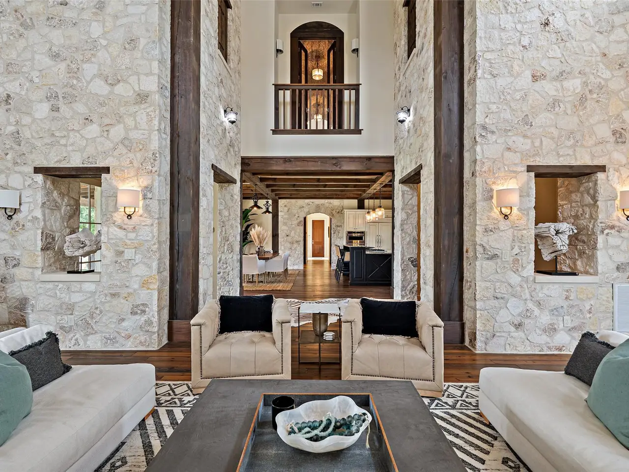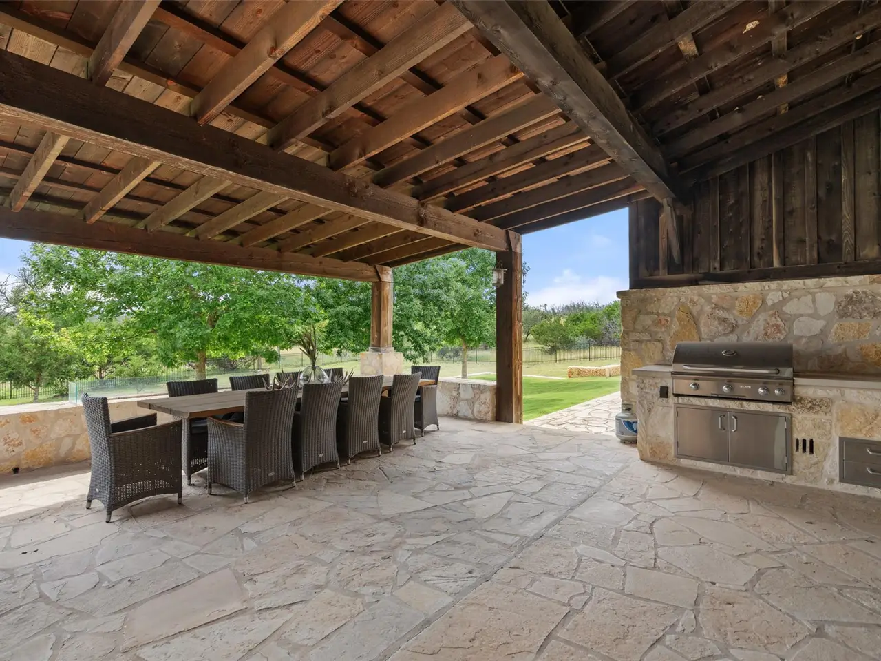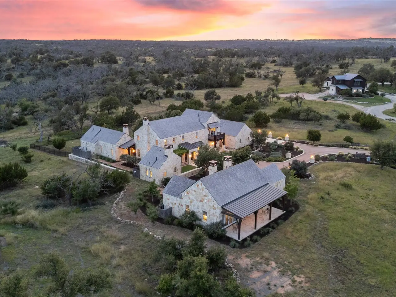 OPEN HOUSE ATTENDEES MUST REGISTER WITH AGENT! Discover the perfect blend of rustic charm and refined living in this expansive custom-built 6-bedroom, 6.5-bath, 5,637-square foot ranch-style retreat--featuring 3 private casitas, ideal for multigenerational living or hosting guests in style. Nestled in the heart of the Hill Country on 2.54 acres, this serene property offers comfort, flair, and Texas hospitality. Inside, you'll find a beautifully crafted interior that brings the outdoors in, with rich wood beams, interior limestone walls, custom cabinetry, and hand-selected moldings throughout. The great room impresses with soaring ceilings, abundant natural light from large windows, and one of the home's five wood-burning fireplaces. The kitchen is a chef's dream, featuring granite countertops, a 6-burner stove, and a wet bar perfect for entertaining. Bar top seating along with a formal dining area, a walk in pantry and generously sized laundry room complete the space. The property's two spacious indoor living areas offer plenty of room to relax or host, while plantation shutters and hardwood floors from a distillery add timeless charm and privacy. The owner's retreat is a true sanctuary, featuring its own fireplace and thoughtful upgrades throughout. Whether you're looking for a private getaway, or a place to host family and friends, this home offers it all--luxury, warmth, and tranquility. Step outside to expansive outdoor living spaces, where multiple patios invite dining, lounging, and entertaining under the Texas sky. Enjoy peaceful views from the covered patio or gather around one of the fireplaces for a cozy evening under the stars. Boot Ranch is a private, gated community spanning 2,080 acres, featuring a top-tier golf club, three heated pools, a pavilion with a bar and grill, tennis courts, pickleball, basketball, a fitness center, Longhorn Lake, a shooting range, bike trails, and a market center--all just 4 miles from the nearest grocery store.