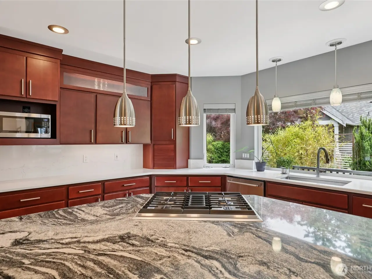 Gorgeous custom home perched above the rest with sunrise & sunset views! Double tiered wood wrapped windows in living room. Hardwood floors carry through majority of main floor. Cozy sitting room & dining room off entry. Chefs kitchen with abundant cabinets, granite slabs, built in eating nook, pantry & access to deck for easy bbqs & private dining among the lush plantings. Main floor Family room could double as game room or Primary on the main with 3/4 bath & sauna. Luxurious primary suite features views of Mt Rainier from private balcony, 5 piece bath with gracious shower, soaking tub & walk-in closet. Lower floor features rec room & 1/2 bath plumbed for shower. 3 car garage has room for workshop. Walking trails & boat launch nearby.