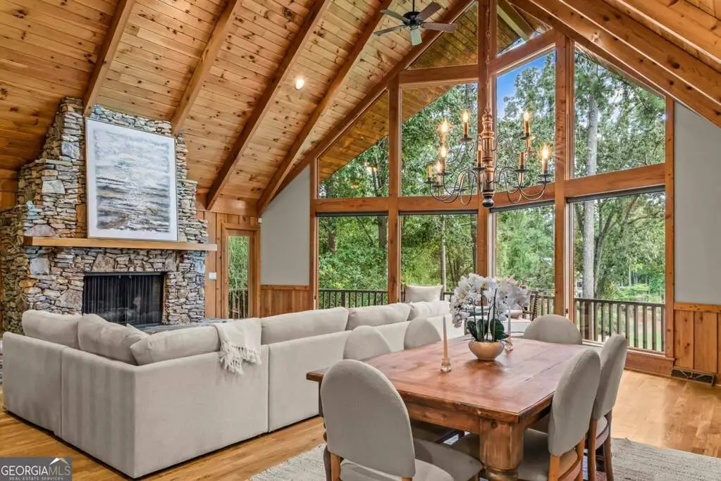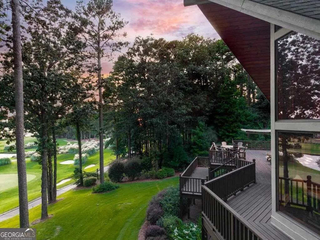 This beautifully maintained golf course home offers sweeping views of holes 2, 3 & 4 of The Landing course, a pond view, and looking down the fairway to the stunning water of Lake Oconee-views from this home are so exquisite, they have been featured in Reynolds Magazine Advertisements over the years. Designed with large, light-filled spaces and walls of windows, the open-concept layout brings the outdoors in. The main level features two bedrooms, a gourmet kitchen, and expansive living and dining areas perfect for entertaining. Enjoy peaceful mornings and breathtaking sunsets from the large multi-level wraparound deck. Ideally situated in The Landing of Reynolds Lake Oconee with access to world-class amenities, golf, lake life, and more. This is a rare opportunity to own one of the best view properties in the community. Seller makes a Club membership available for Buyer to explore how they can enjoy golf, sporting grounds, tennis, pickleball, fitness, recreational, and culinary amenities of a world-class private club.