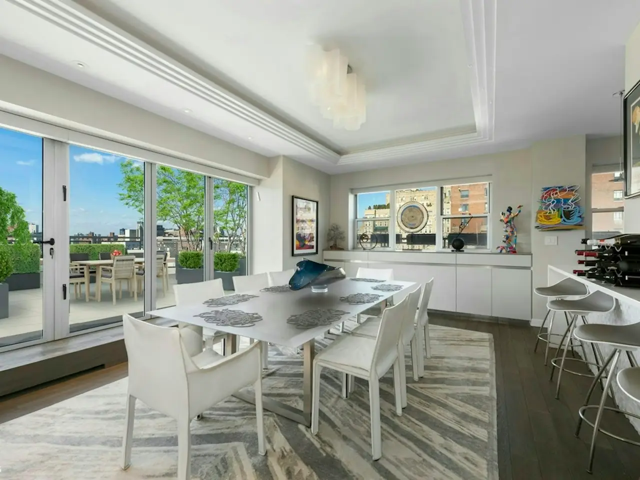 Trophy Terrace at 2 Fifth! Sleek and renovated to perfection, this spectacular Greenwich Village 3 bedroom/3 bath (see alternate floorplan) with unobstructed views, over 9" ceilings, and more than 1,250 square feet of private terraces is the pinnacle of luxury living. Custom retractable glass doors in the living/dining area create a seamless indoor/outdoor experience leading to your majestic terrace. Dramatic open vistas in 3 directions and outdoor space for personal serenity, or cocktails, hors d'oeuvres and dinner is truly rarefied air. A retractable projection TV, built-in Sonos audio, and remote electric solar shades, provides the perfect entertainment combination. Poggenpohl cabinets, top-of-the-line appliances, Caesarstone countertops, water filtration and a built-in coffee station makes this kitchen a cook's favorite. The primary bedroom is over 20' long with Poliform leather-wrapped closets and built-in desk. The en suite bathroom has double sinks, a soaking tub with rainfall shower, and heated towel rack and floors. The second bedroom has its own private terrace and en suite bathroom with steam shower and dressing area. Lutron lighting, Savant smart home system, built-in humidifying system, and all new windows are the perfect must haves. A third full bathroom and generous separate laundry room complete this move-in ready Gold Coast experience. Two Fifth Avenue is a full-service white-glove building in the Gold Coast of Greenwich Village. There is a gym, adult lounge, children's playroom, private library, storage bins, bike room and on-site dry cleaner. Pied-a-terre, pets and co-purchasing are all allowed with board approval. A garage and the circular driveway add to the long list of amenities making this building one of the finest around. Located in one of the most desirable locations in all of New York City; close to fabulous restaurants, shopping and of course, iconic Washington Square Park.
