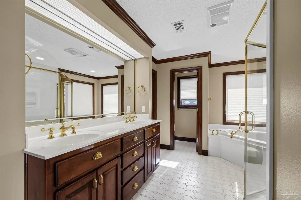Experience the best of Gulf Breeze living in this stunning home located in the heart of Gulf Breeze Proper. Natural light pours through two levels of windows, illuminating the grand living room with its soaring ceilings, gas fireplace, and impressive grand staircase. The open-concept design creates a seamless flow into the expansive kitchen, an ideal space for family gatherings and entertaining. The kitchen boasts an abundance of cabinetry, stainless steel appliances, granite countertops, an island with breakfast bar, and a charming dining area framed by a large window offering serene water views. The first floor also features a spacious guest bedroom with a private bathroom, perfect for visitors. Upstairs, the luxurious primary suite offers a generous sitting area with a view of the water. The primary bath is outfitted with a walk-in closet, dual vanities, a jetted tub, and a separate shower. An additional upstairs bedroom, complete with an en-suite bath and water views, provides comfort and privacy. Additional highlights include an elevator, 2020 roof, security system, and a massive 4+ car garage with a workshop area. Situated just moments from Shoreline Waterfront Park, boat launch facilities, and a recreation center with a children's waterpark, and only a short drive to the pristine beaches of Pensacola, this home perfectly blends luxury, convenience, and coastal living.