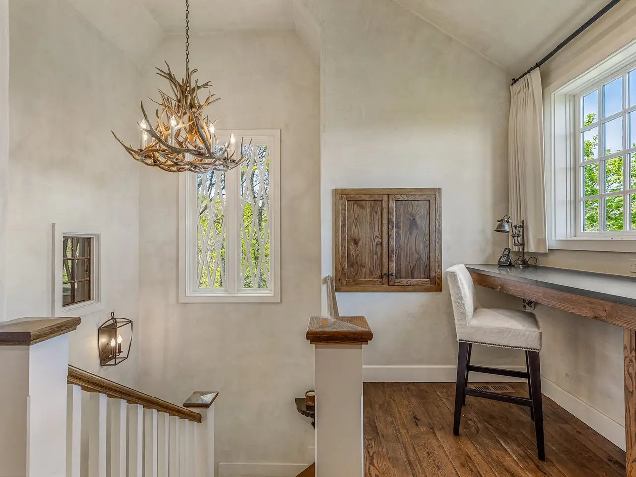 • Stone-and-stucco fireplace