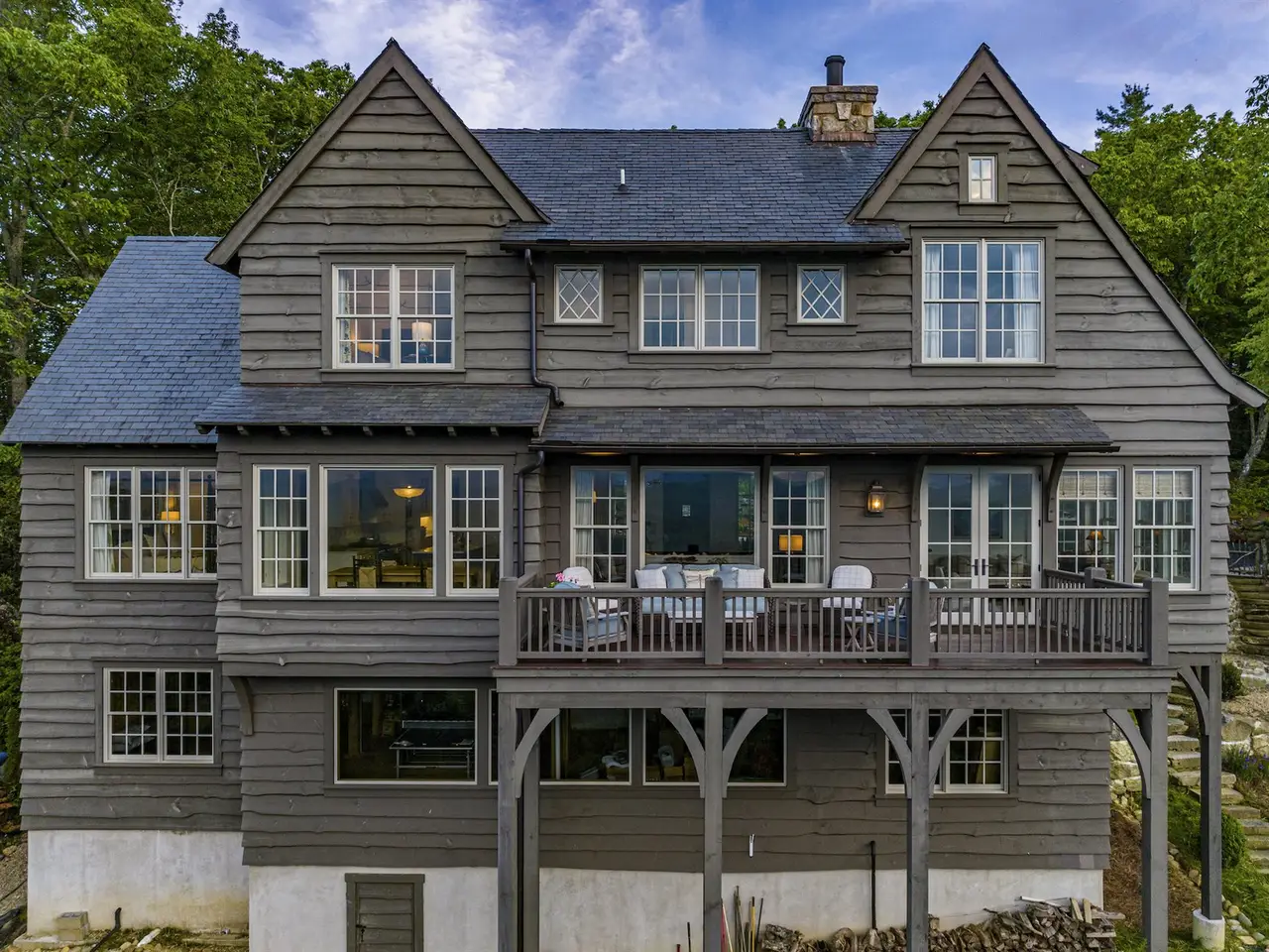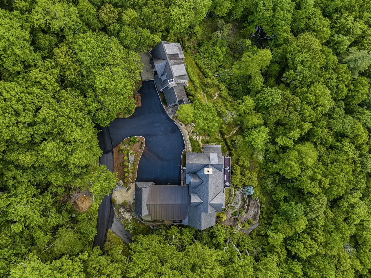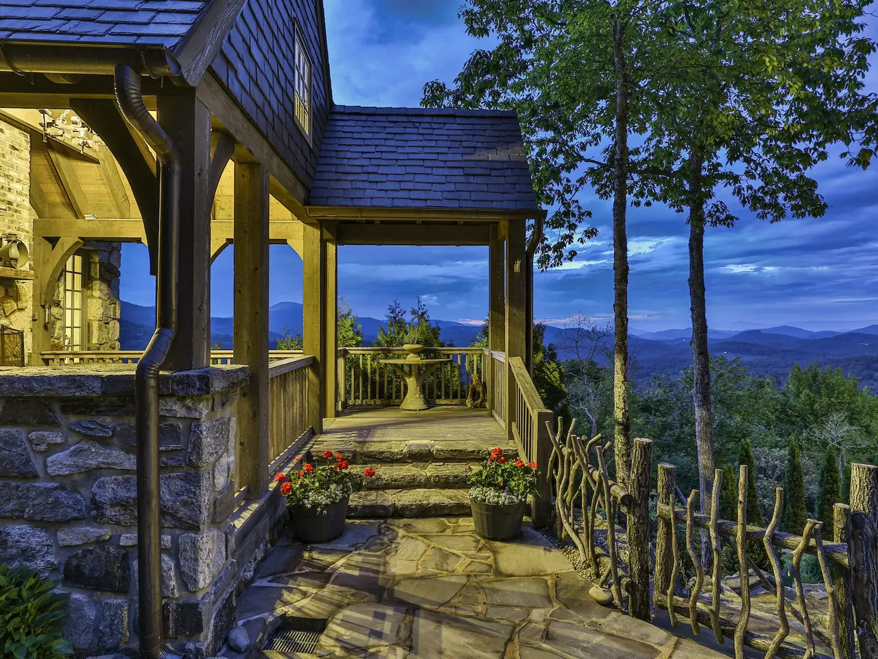 Welcome to an extraordinary European-style estate in the heart of Highlands - where timeless charm meets refined mountain living. This remarkable and majestic property includes a beautifully designed main residence and an enchanting stone guest cottage, both showcasing sweeping panoramic views of the Blue Ridge Mountains, Old Edwards Golf Course, and a serene lake. Crafted by award-winning Mountainworks Custom Home Design, the main house features an elegant slate roof and was honored with the Designer's Choice Award by the American Institute of Building Design, as well as Best of Show. The interior is a masterclass in sophistication, offering a sun-drenched kitchen equipped with top-of-the-line Miele appliances, a built-in coffee station, and an oversized island perfect for gathering. The adjoining sunroom invites peaceful mornings and golden-hour sunsets, while the spacious deck serves as your front-row seat to the plateau's natural, incredible views and cool breezes at an elevation above 4200 ft. The main level includes a tranquil bedroom with an ensuite bath and views of a curated cutting garden. Upstairs, a light-filled office/library provides inspiration with every glance out the window. The luxurious primary suite boasts postcard-perfect views from every angle and a luxurious bath with a serene soaking tub overlooking the clouds as they float by over the mountains. Just steps away, the guest cottage is a storybook escape with two private bedrooms - each with ensuite baths. Enter through a charming Dutch door into a warm and inviting interior that evokes the coziness of an English Cotswold cottage. A elegant yet stately stone-and-stucco fireplace anchors the living area, while a covered porch with a second fireplace offers the perfect perch for enjoying cool mountain breezes and stargazing in the evenings. The sale includes buildable main house basement plans for future expansion and the home and guest cottage are being offered fully furnished - including elegant bespoke custom furniture, designer linens, draperies, select artwork, and curated decor that enhances its distinctive character, with a small list of exceptions. A one-of-a-kind retreat, impeccably maintained and thoughtfully designed - this is luxury mountain living at its finest. The mesmerizing views change with the four seasons whether watching the clouds below changing shapes to glorious reds and golds of fall to snowflakes that glisten past - it's magical in every way.